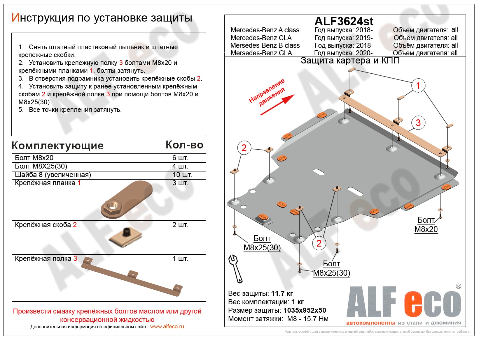 Защита картера и КПП (большая) ALFeco арт. ALF3624al-1 изготовлена из алюминия толщиной 4мм специально для автомобиля MB B-Class (W247) 2018-. Обеспечивает надежную защиту агрегатов от механических повреждений и попадания дорожной грязи и других предметов, встречающихся на проезжей части, способных зачастую нанести серьезный вред автомобилю. В комплекте идет весь необходимый крепеж для установки. Наличие можно уточнить по телефону. Возможна установка в нашем автосервисе по предварительной записи