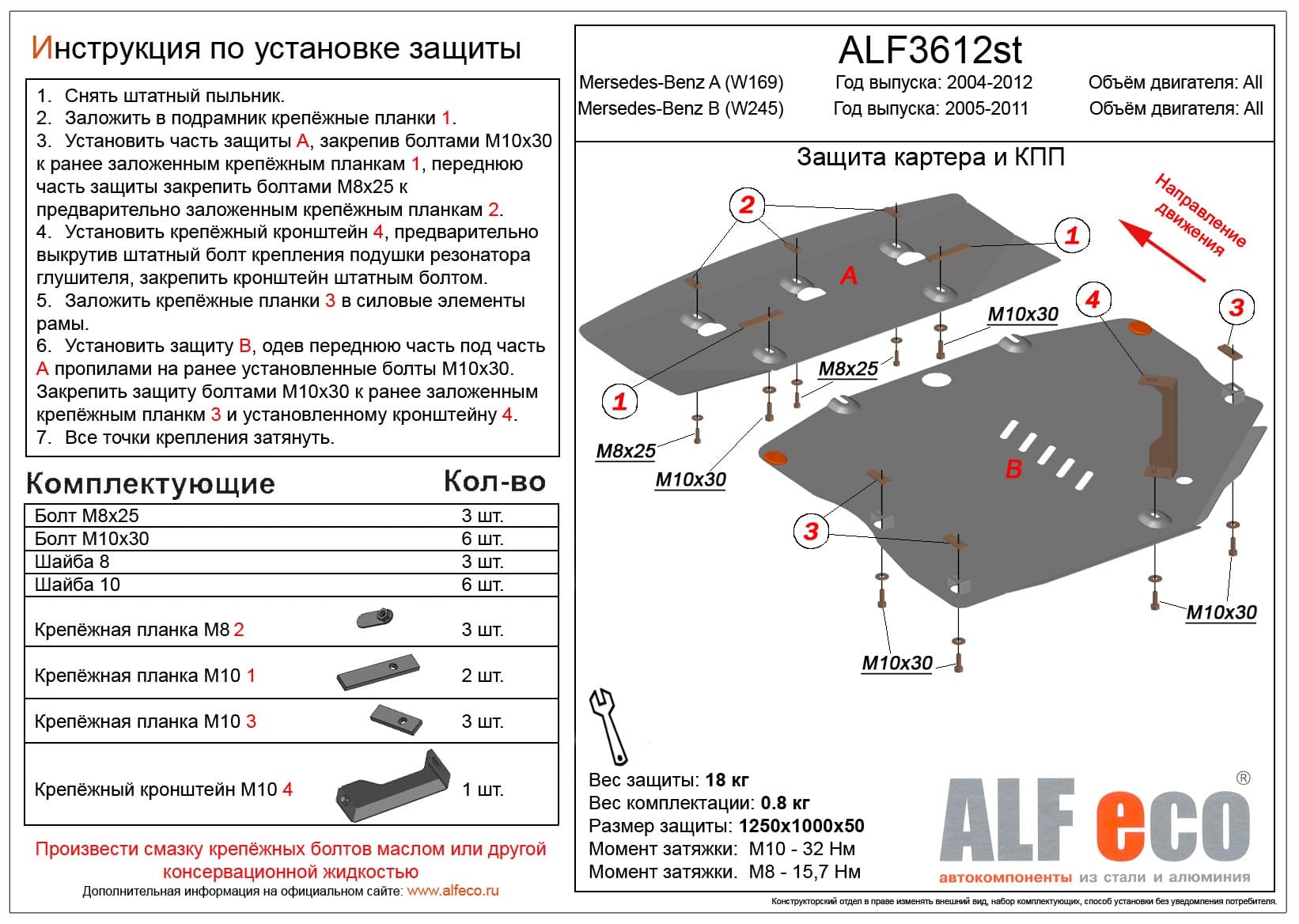 Защита картера и КПП (2 части) MB B-Class (W245) 2005-2011 V-1,5; 1,7; 2,0 , ALFeco, алюминий 4мм, арт. ALF3612al-1