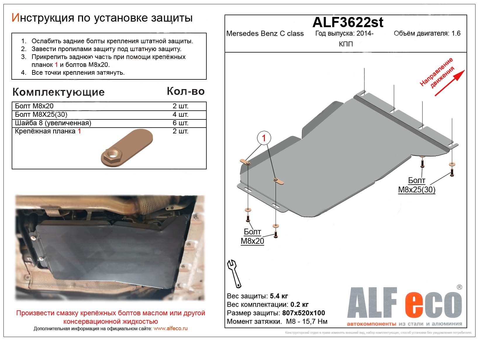 Защита  КПП MB C-Class (W205) 2014- V-1,6 , ALFeco, сталь 2мм, арт. ALF3622st