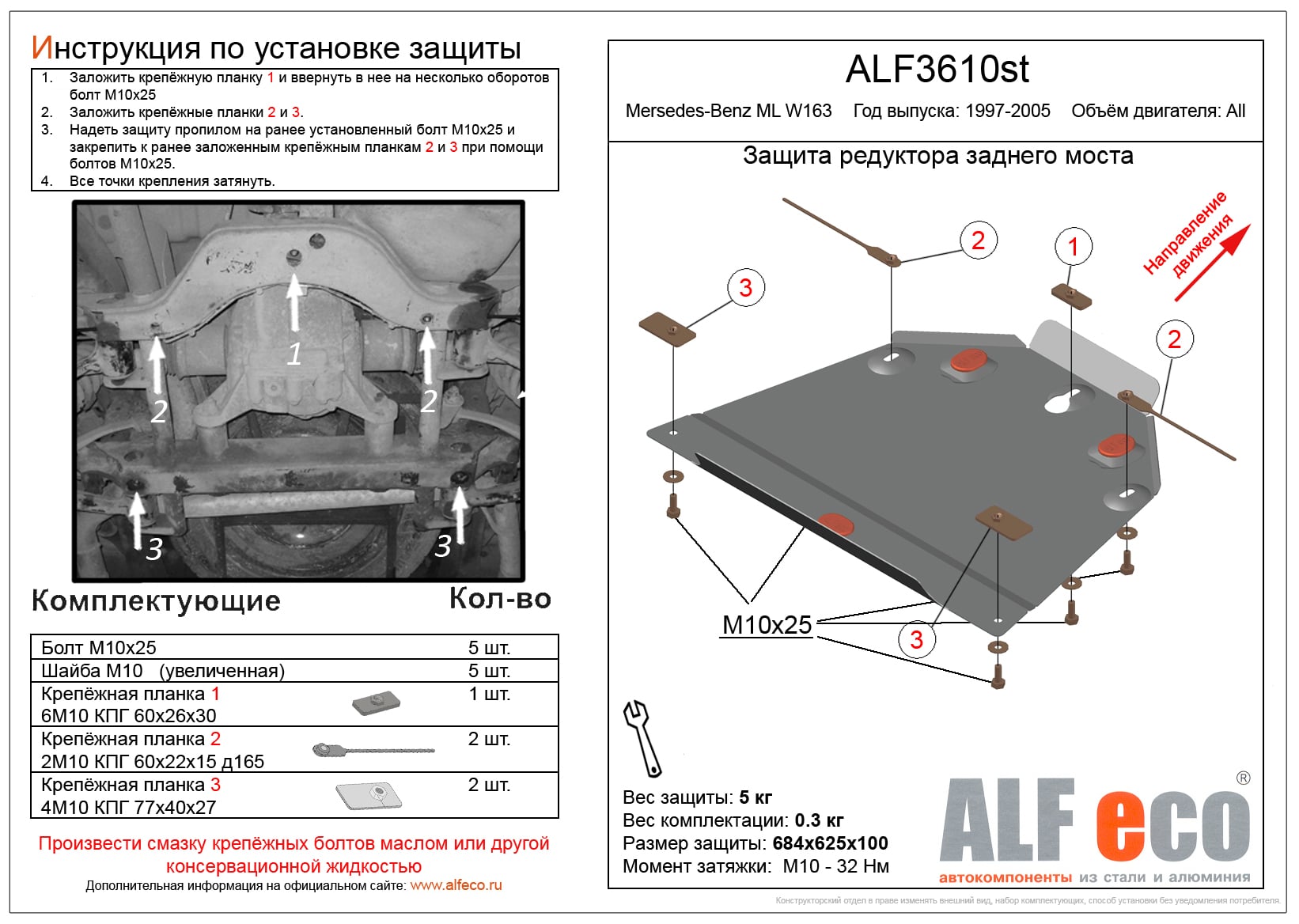Защита редуктора заднего моста ALFeco арт. ALF3610al изготовлена из алюминия толщиной 4мм специально для автомобиля MB ML (W163) 1997-2005. Обеспечивает надежную защиту агрегатов от механических повреждений и попадания дорожной грязи и других предметов, встречающихся на проезжей части, способных зачастую нанести серьезный вред автомобилю. В комплекте идет весь необходимый крепеж для установки. Наличие можно уточнить по телефону. Возможна установка в нашем автосервисе по предварительной записи