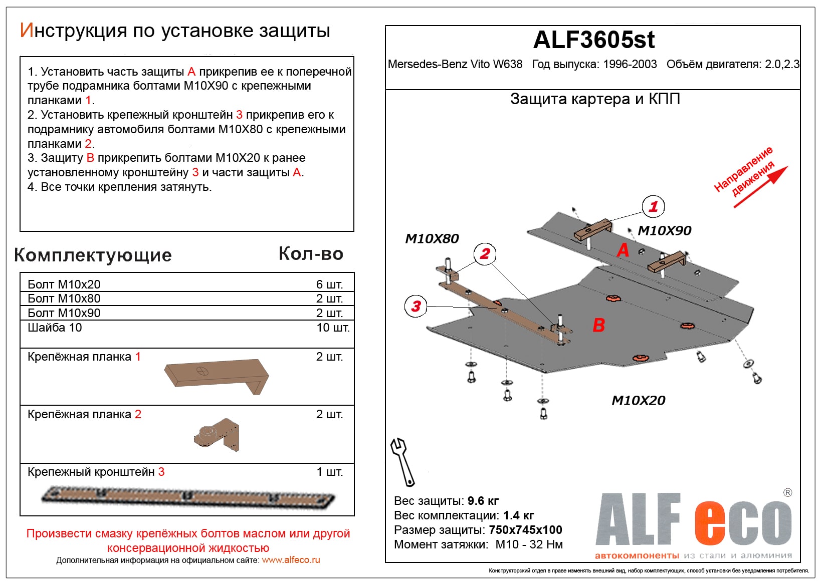 Защита картера и КПП ALFeco арт. ALF3605al изготовлена из алюминия толщиной 4мм специально для автомобиля MB Vito (W638) 1996-2003. Обеспечивает надежную защиту агрегатов от механических повреждений и попадания дорожной грязи и других предметов, встречающихся на проезжей части, способных зачастую нанести серьезный вред автомобилю. В комплекте идет весь необходимый крепеж для установки. Наличие можно уточнить по телефону. Возможна установка в нашем автосервисе по предварительной записи