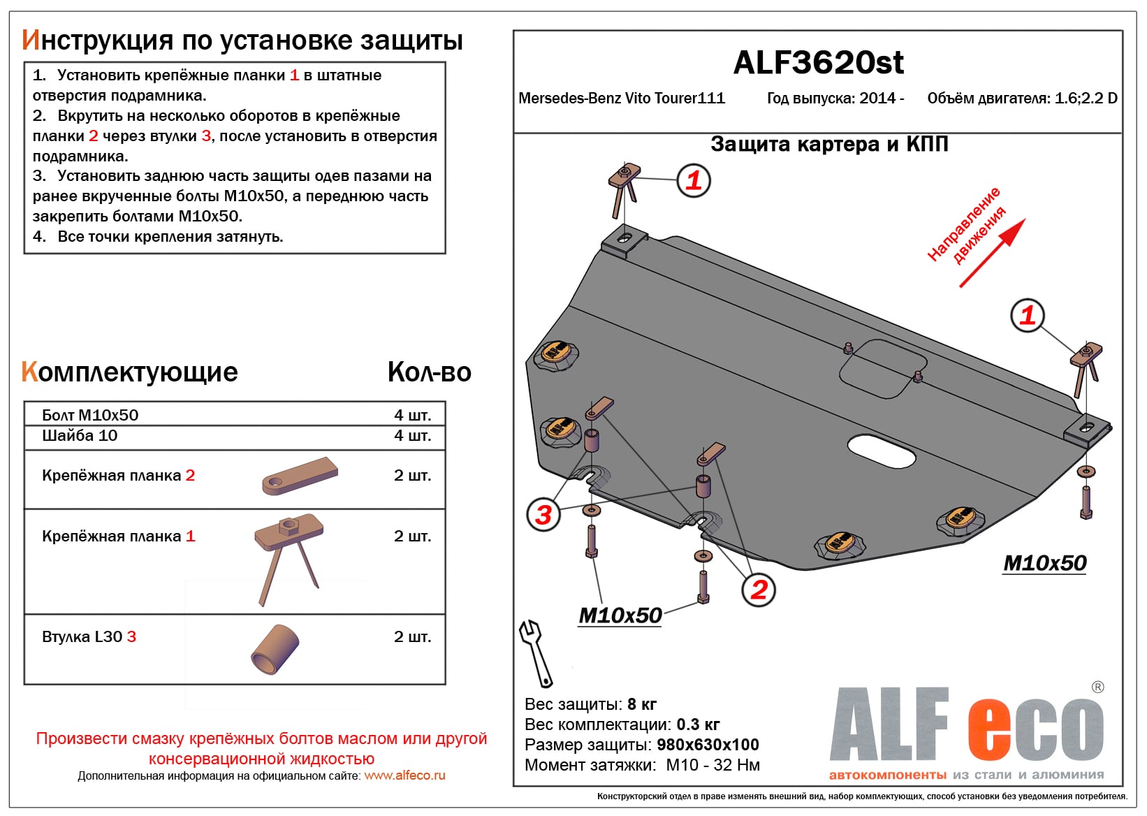 Защита картера и КПП ALFeco арт. ALF3620al изготовлена из алюминия толщиной 4мм специально для автомобиля MB Vito (W447) 2014-. Обеспечивает надежную защиту агрегатов от механических повреждений и попадания дорожной грязи и других предметов, встречающихся на проезжей части, способных зачастую нанести серьезный вред автомобилю. В комплекте идет весь необходимый крепеж для установки. Наличие можно уточнить по телефону. Возможна установка в нашем автосервисе по предварительной записи