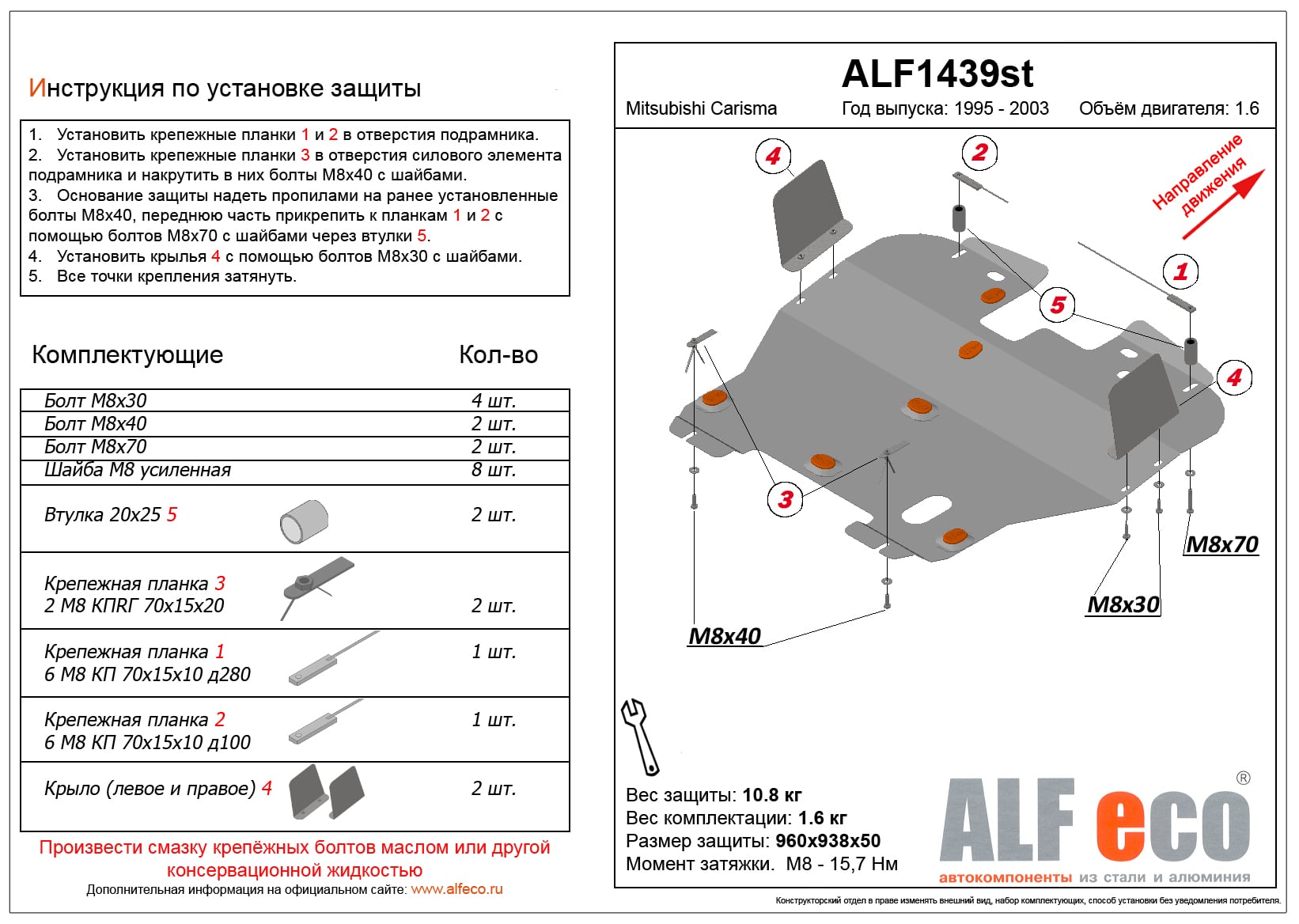 Защита картера и КПП ALFeco арт. ALF1439al изготовлена из алюминия толщиной 4мм специально для автомобиля Mitsubishi Carisma 1995-2003. Обеспечивает надежную защиту агрегатов от механических повреждений и попадания дорожной грязи и других предметов, встречающихся на проезжей части, способных зачастую нанести серьезный вред автомобилю. В комплекте идет весь необходимый крепеж для установки. Наличие можно уточнить по телефону. Возможна установка в нашем автосервисе по предварительной записи