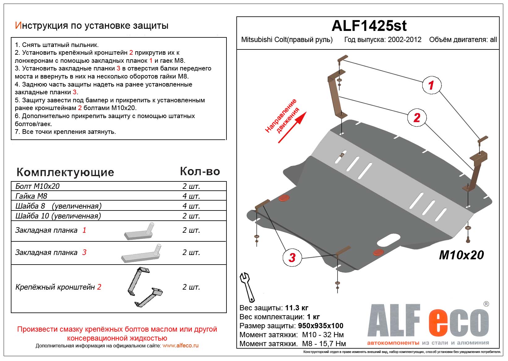Защита картера и КПП (правый руль) ALFeco арт. ALF1425al изготовлена из алюминия толщиной 4мм специально для автомобиля Mitsubishi Colt VI 2002-2011. Обеспечивает надежную защиту агрегатов от механических повреждений и попадания дорожной грязи и других предметов, встречающихся на проезжей части, способных зачастую нанести серьезный вред автомобилю. В комплекте идет весь необходимый крепеж для установки. Наличие можно уточнить по телефону. Возможна установка в нашем автосервисе по предварительной записи