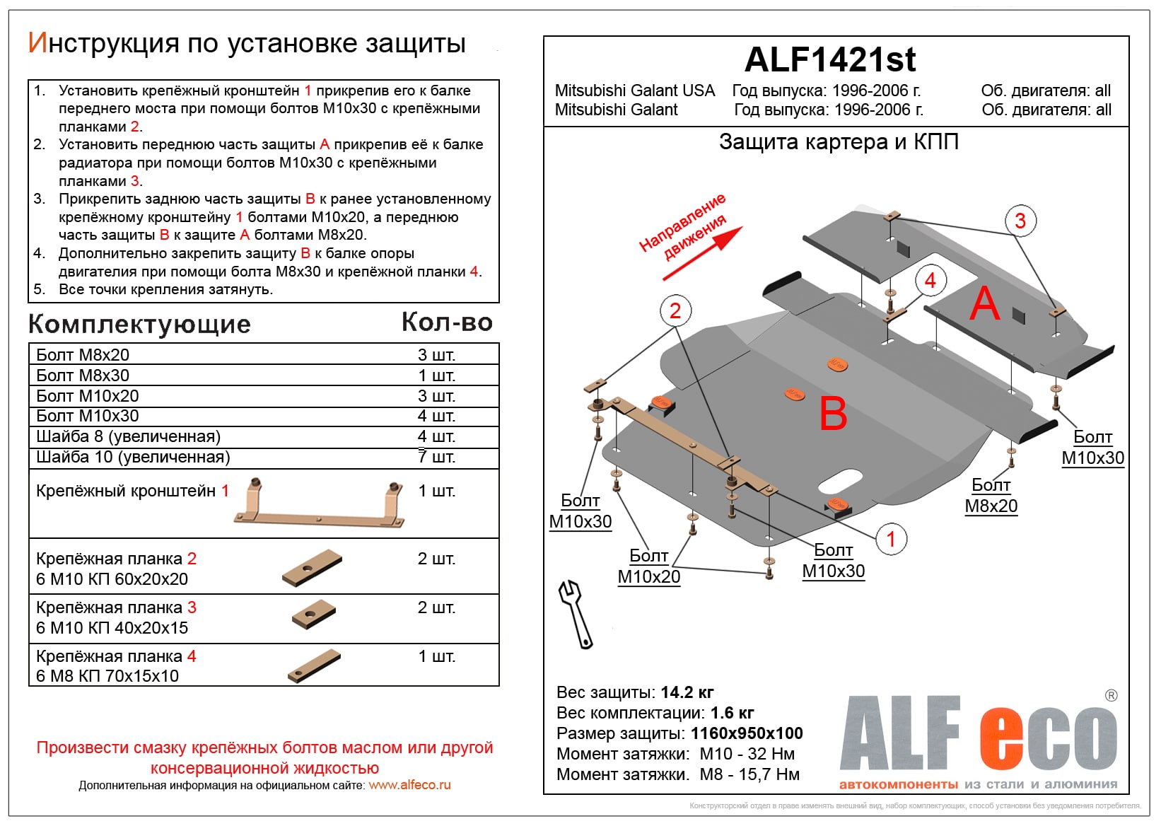 Защита картера и КПП (2 части) ALFeco арт. ALF1421al изготовлена из алюминия толщиной 4мм специально для автомобиля Mitsubishi Galant VIII1996-2006. Обеспечивает надежную защиту агрегатов от механических повреждений и попадания дорожной грязи и других предметов, встречающихся на проезжей части, способных зачастую нанести серьезный вред автомобилю. В комплекте идет весь необходимый крепеж для установки. Наличие можно уточнить по телефону. Возможна установка в нашем автосервисе по предварительной записи