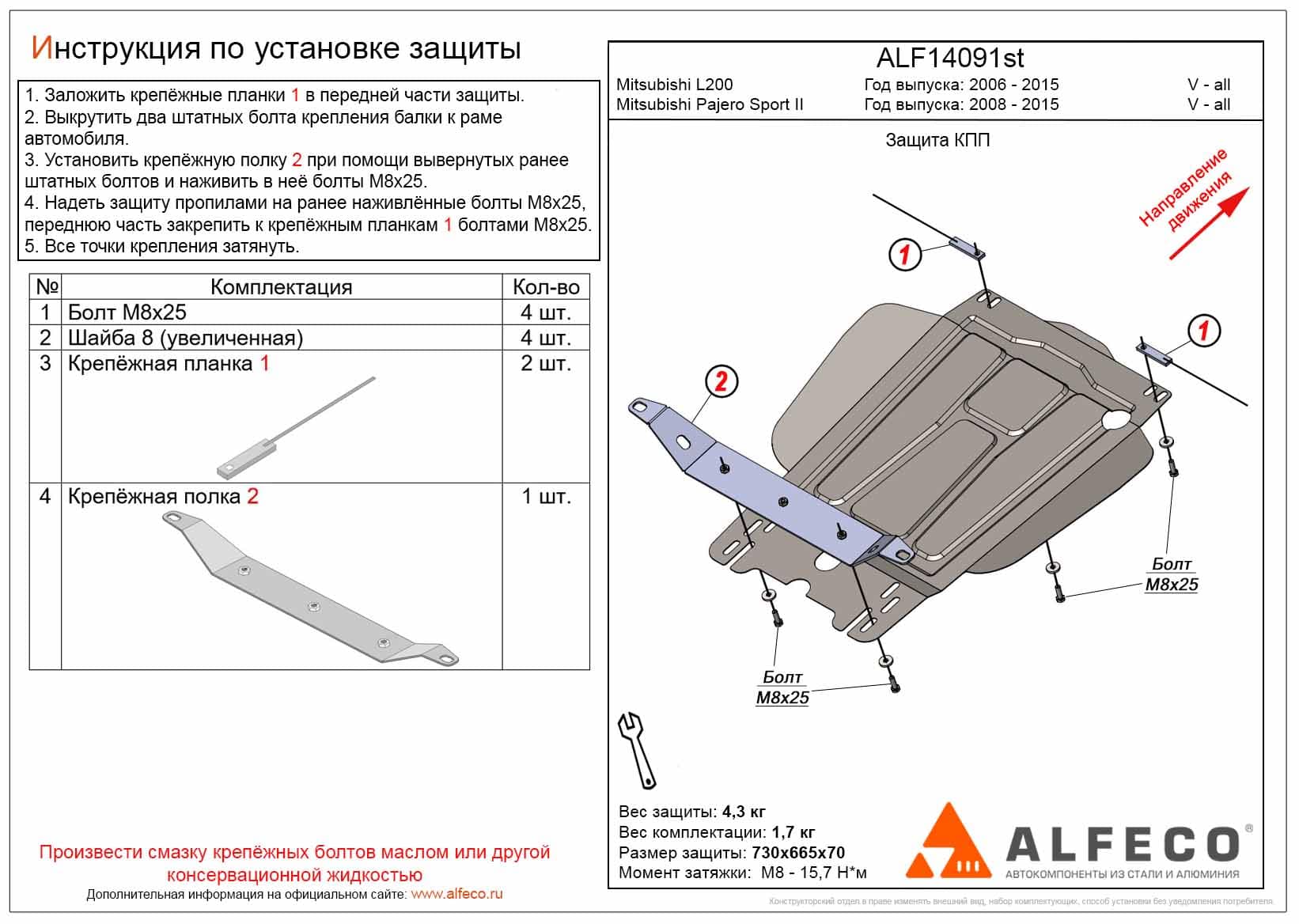Защита КПП ALFeco арт. ALF14091st изготовлена из стали толщиной 1.5мм специально для автомобиля Mitsubishi L200 2006-2015. Обеспечивает надежную защиту агрегатов от механических повреждений и попадания дорожной грязи и других предметов, встречающихся на проезжей части, способных зачастую нанести серьезный вред автомобилю. В комплекте идет весь необходимый крепеж для установки. Наличие можно уточнить по телефону. Возможна установка в нашем автосервисе по предварительной записи