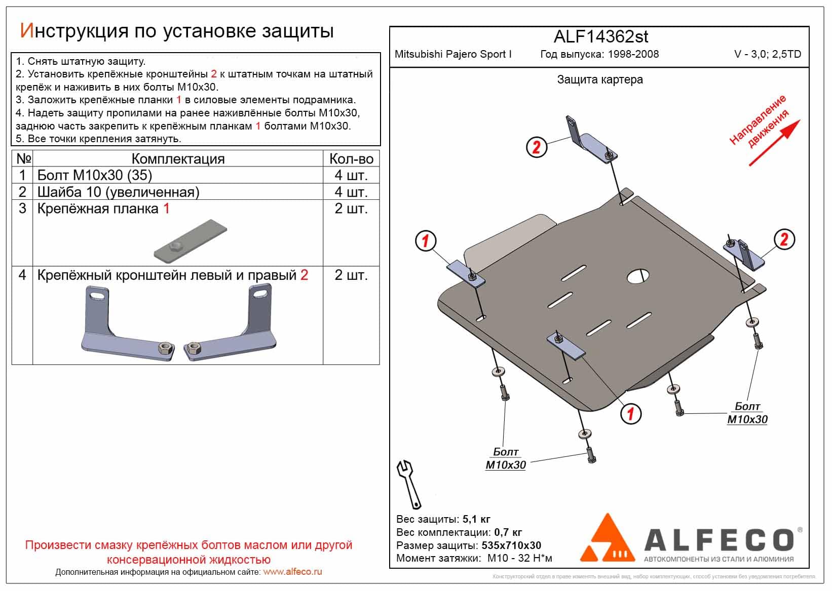 Защита картера ALFeco арт. ALF14362st изготовлена из стали толщиной 2мм специально для автомобиля Mitsubishi Pajero Sport I 1998-2008. Обеспечивает надежную защиту агрегатов от механических повреждений и попадания дорожной грязи и других предметов, встречающихся на проезжей части, способных зачастую нанести серьезный вред автомобилю. В комплекте идет весь необходимый крепеж для установки. Наличие можно уточнить по телефону. Возможна установка в нашем автосервисе по предварительной записи
