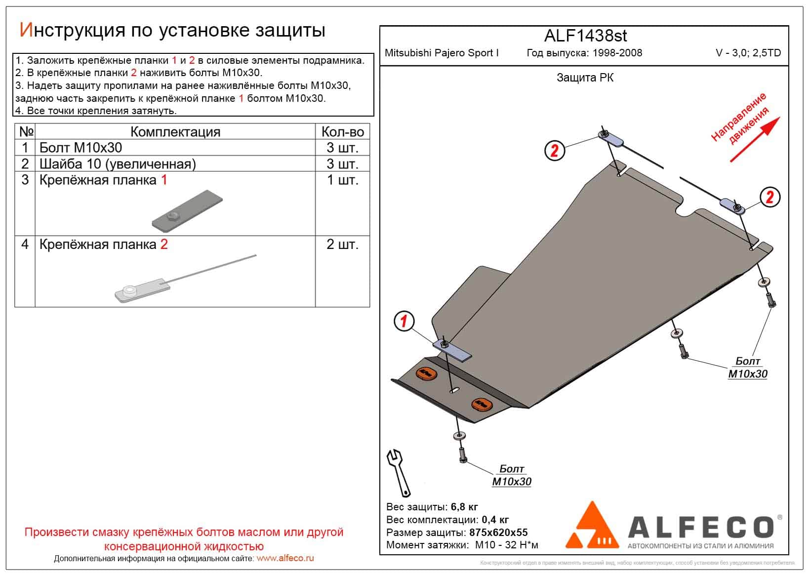 Защита РК ALFeco арт. ALF1438st изготовлена из стали толщиной 2мм специально для автомобиля Mitsubishi Pajero Sport I 1998-2008. Обеспечивает надежную защиту агрегатов от механических повреждений и попадания дорожной грязи и других предметов, встречающихся на проезжей части, способных зачастую нанести серьезный вред автомобилю. В комплекте идет весь необходимый крепеж для установки. Наличие можно уточнить по телефону. Возможна установка в нашем автосервисе по предварительной записи