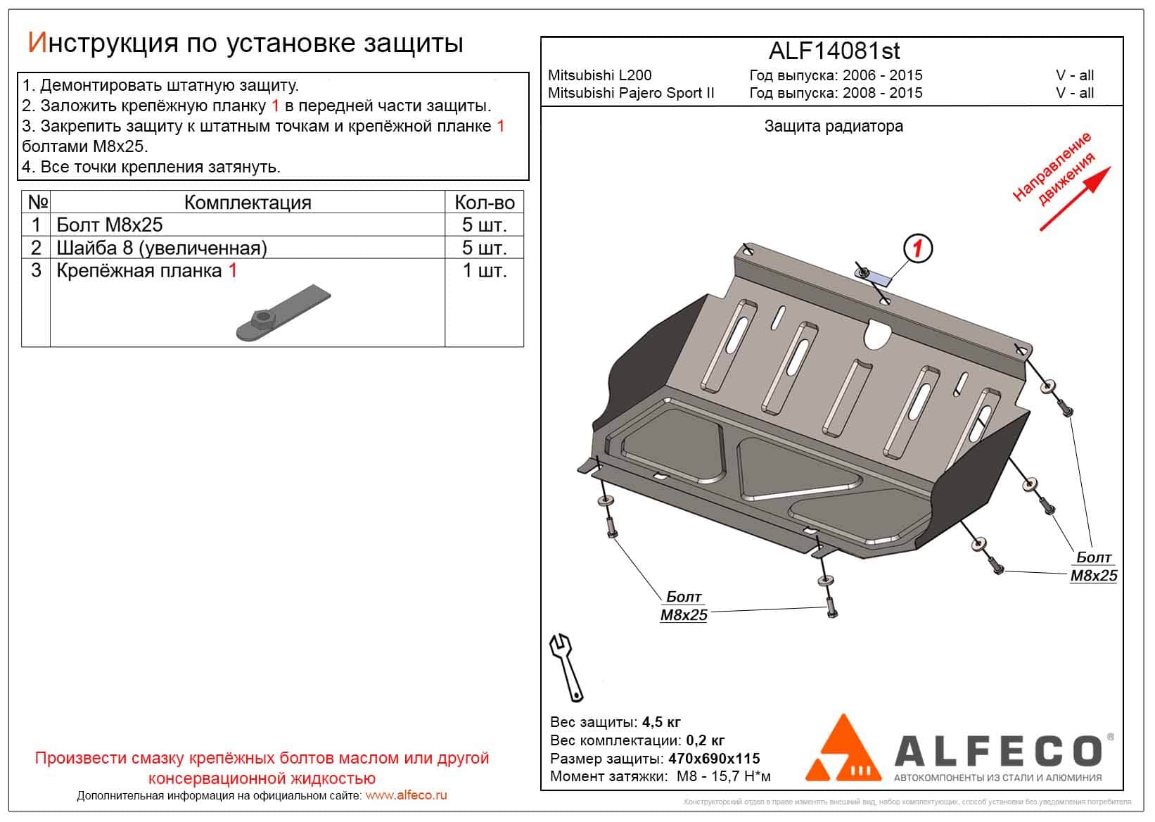 Защита радиатора ALFeco арт. ALF14081al-1 изготовлена из алюминия толщиной 4мм специально для автомобиля Mitsubishi Pajero Sport II 2008-2015. Обеспечивает надежную защиту агрегатов от механических повреждений и попадания дорожной грязи и других предметов, встречающихся на проезжей части, способных зачастую нанести серьезный вред автомобилю. В комплекте идет весь необходимый крепеж для установки. Наличие можно уточнить по телефону. Возможна установка в нашем автосервисе по предварительной записи