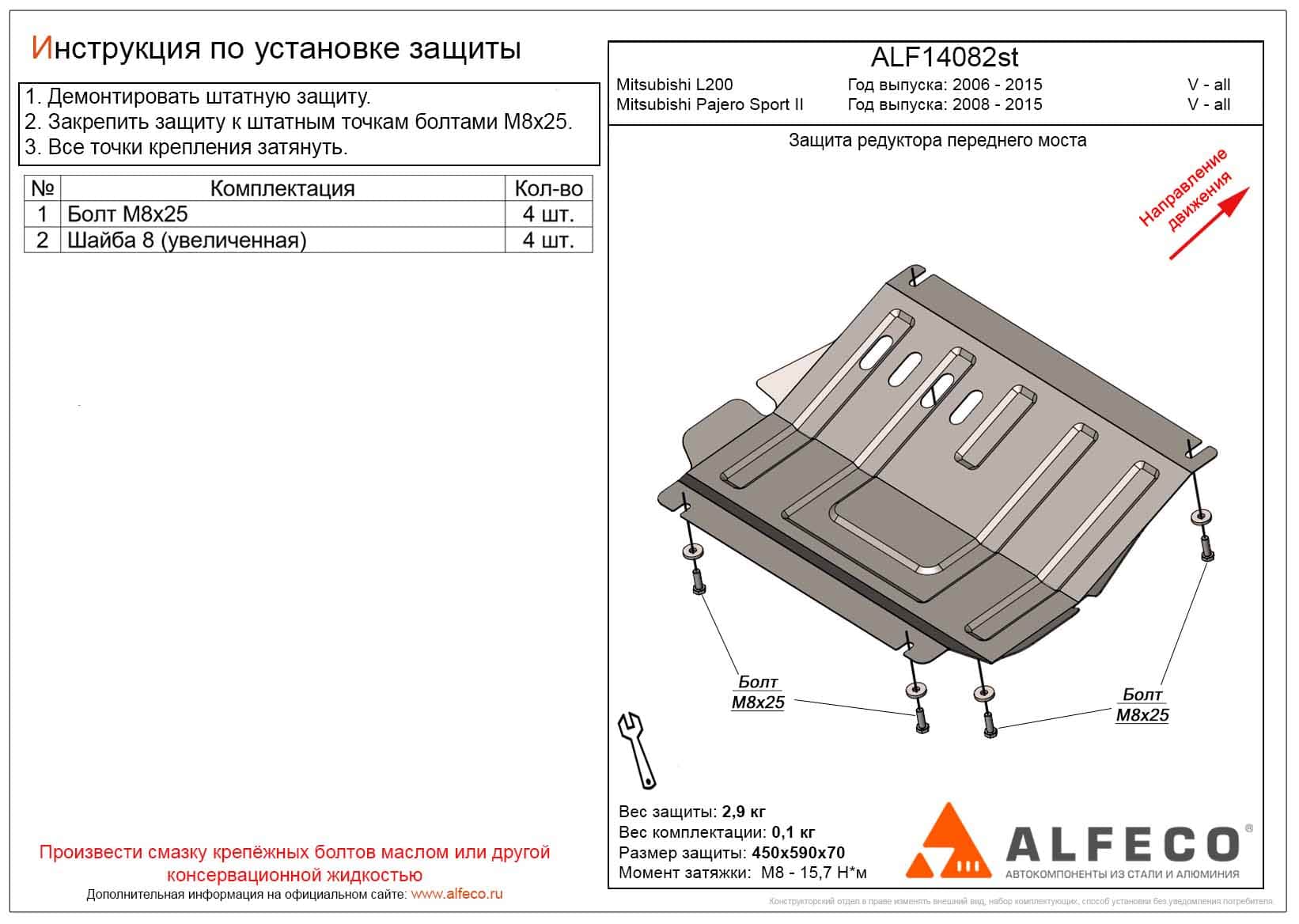 Защита картера ALFeco арт. ALF14082st-1 изготовлена из стали толщиной 1.5мм специально для автомобиля Mitsubishi Pajero Sport II 2008-2015. Обеспечивает надежную защиту агрегатов от механических повреждений и попадания дорожной грязи и других предметов, встречающихся на проезжей части, способных зачастую нанести серьезный вред автомобилю. В комплекте идет весь необходимый крепеж для установки. Наличие можно уточнить по телефону. Возможна установка в нашем автосервисе по предварительной записи
