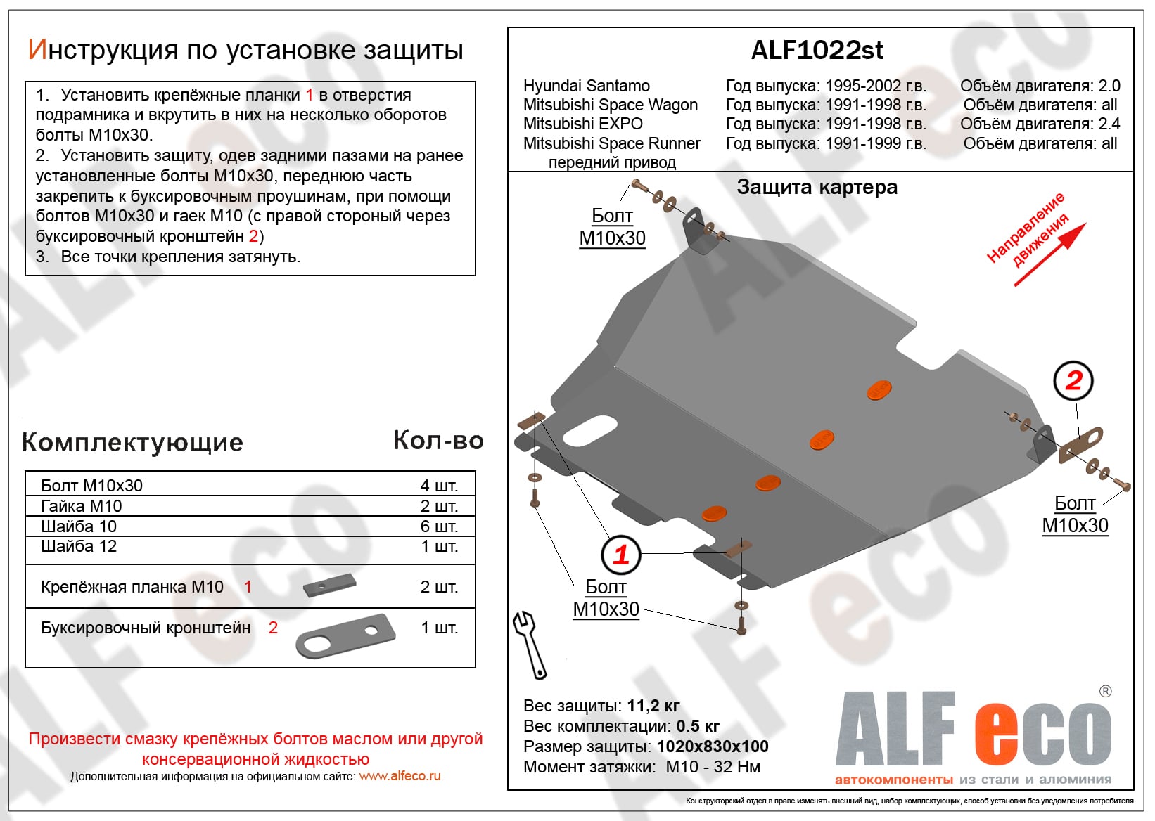 Защита картера и КПП ALFeco арт. ALF1022st-1 изготовлена из стали толщиной 2мм специально для автомобиля Mitsubishi EXPO 1991-1998. Обеспечивает надежную защиту агрегатов от механических повреждений и попадания дорожной грязи и других предметов, встречающихся на проезжей части, способных зачастую нанести серьезный вред автомобилю. В комплекте идет весь необходимый крепеж для установки. Наличие можно уточнить по телефону. Возможна установка в нашем автосервисе по предварительной записи