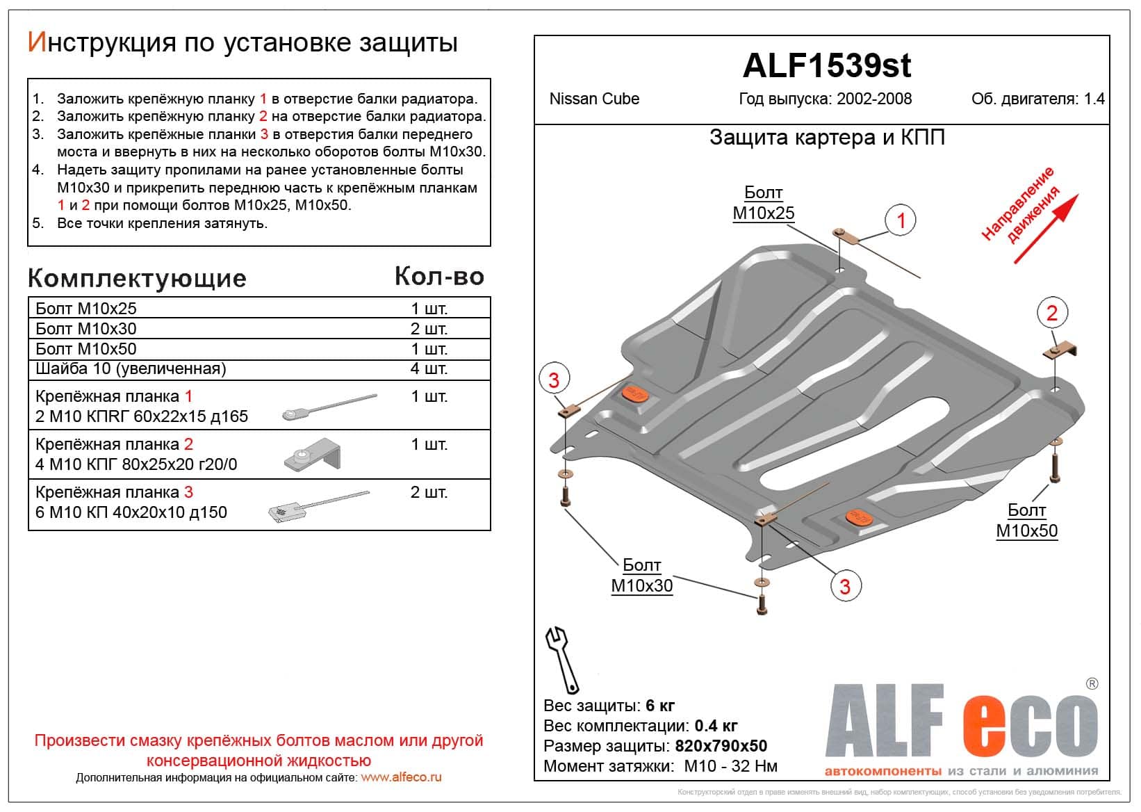 Защита картера и КПП (увеличенная) ALFeco арт. ALF1539st изготовлена из стали толщиной 2мм специально для автомобиля Nissan Cube II (Z11) 2002-2008. Обеспечивает надежную защиту агрегатов от механических повреждений и попадания дорожной грязи и других предметов, встречающихся на проезжей части, способных зачастую нанести серьезный вред автомобилю. В комплекте идет весь необходимый крепеж для установки. Наличие можно уточнить по телефону. Возможна установка в нашем автосервисе по предварительной записи