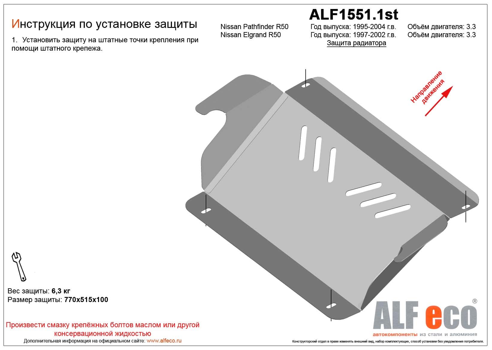 Защита радиатора ALFeco арт. ALF15511st изготовлена из стали толщиной 2мм специально для автомобиля Nissan Elgrand (R50) 1997-2002. Обеспечивает надежную защиту агрегатов от механических повреждений и попадания дорожной грязи и других предметов, встречающихся на проезжей части, способных зачастую нанести серьезный вред автомобилю. В комплекте идет весь необходимый крепеж для установки. Наличие можно уточнить по телефону. Возможна установка в нашем автосервисе по предварительной записи