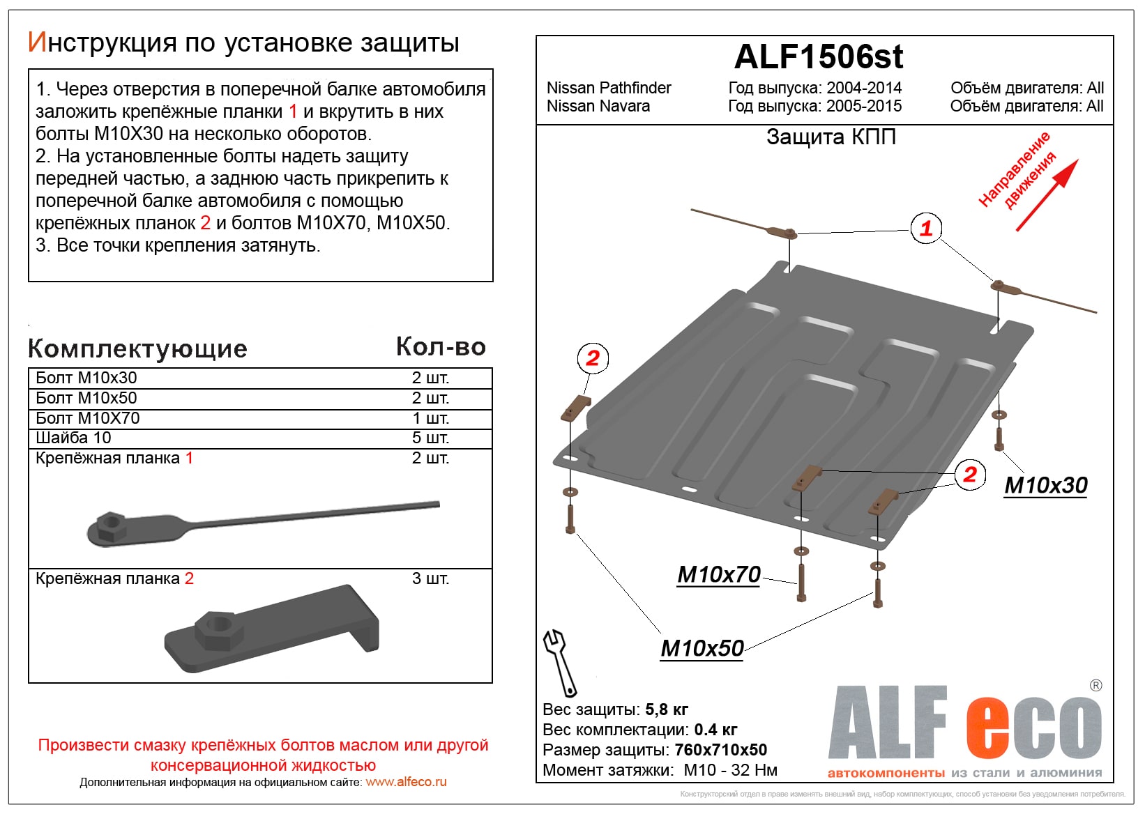 Защита КПП ALFeco арт. ALF1506al изготовлена из алюминия толщиной 4мм специально для автомобиля Nissan Navara (D40) 2005-2015. Обеспечивает надежную защиту агрегатов от механических повреждений и попадания дорожной грязи и других предметов, встречающихся на проезжей части, способных зачастую нанести серьезный вред автомобилю. В комплекте идет весь необходимый крепеж для установки. Наличие можно уточнить по телефону. Возможна установка в нашем автосервисе по предварительной записи
