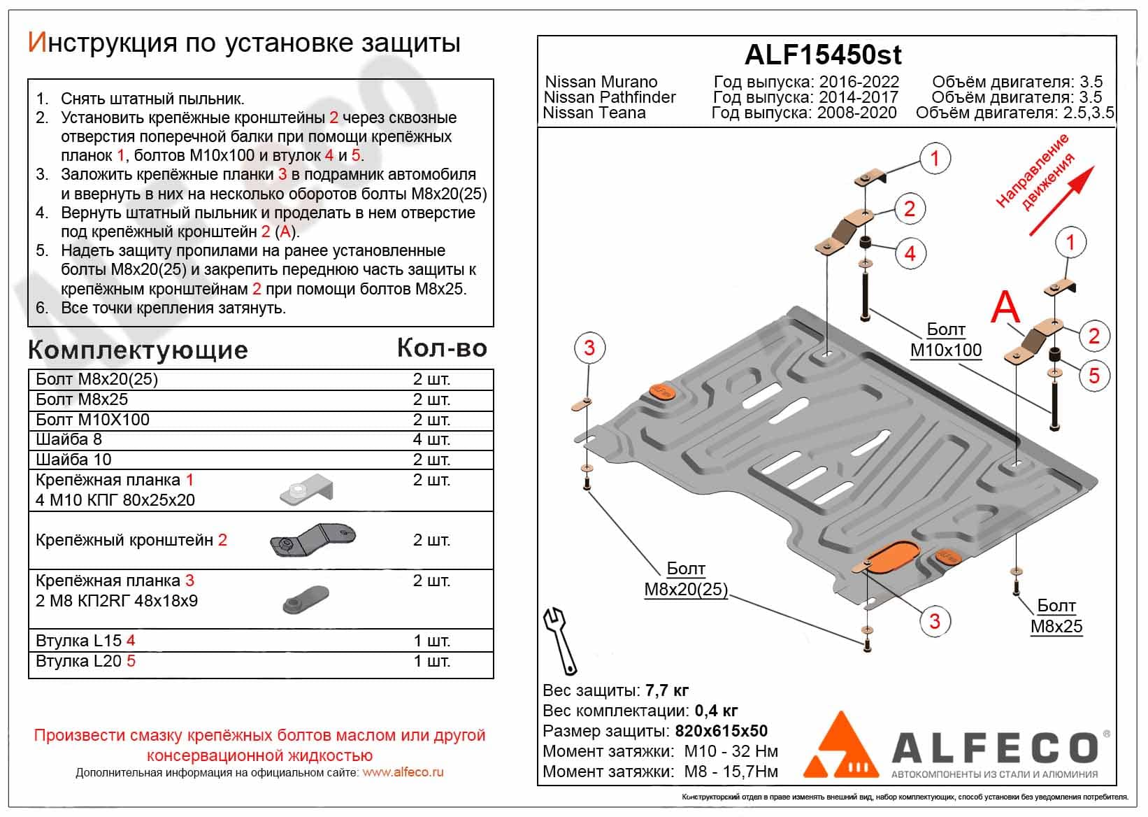 Защита картера и КПП (1,5 мм) ALFeco арт. ALF15450al-1 изготовлена из алюминия толщиной 4мм специально для автомобиля Nissan Pathfinder R52 2014-2017. Обеспечивает надежную защиту агрегатов от механических повреждений и попадания дорожной грязи и других предметов, встречающихся на проезжей части, способных зачастую нанести серьезный вред автомобилю. В комплекте идет весь необходимый крепеж для установки. Наличие можно уточнить по телефону. Возможна установка в нашем автосервисе по предварительной записи
