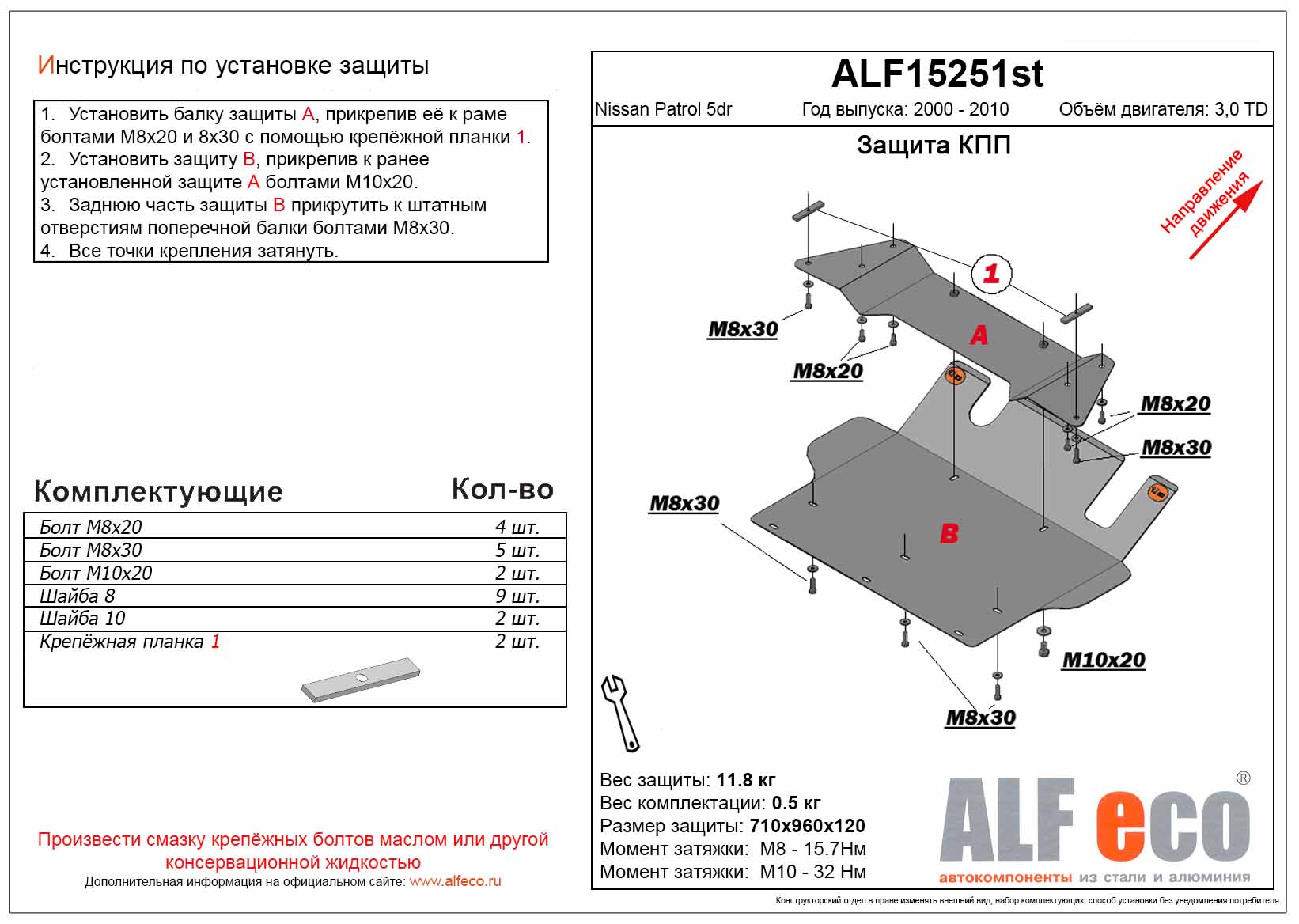 Защита КПП ALFeco арт. ALF15251al изготовлена из алюминия толщиной 4мм специально для автомобиля Nissan Patrol 5dv (Y61) 2000-2010. Обеспечивает надежную защиту агрегатов от механических повреждений и попадания дорожной грязи и других предметов, встречающихся на проезжей части, способных зачастую нанести серьезный вред автомобилю. В комплекте идет весь необходимый крепеж для установки. Наличие можно уточнить по телефону. Возможна установка в нашем автосервисе по предварительной записи