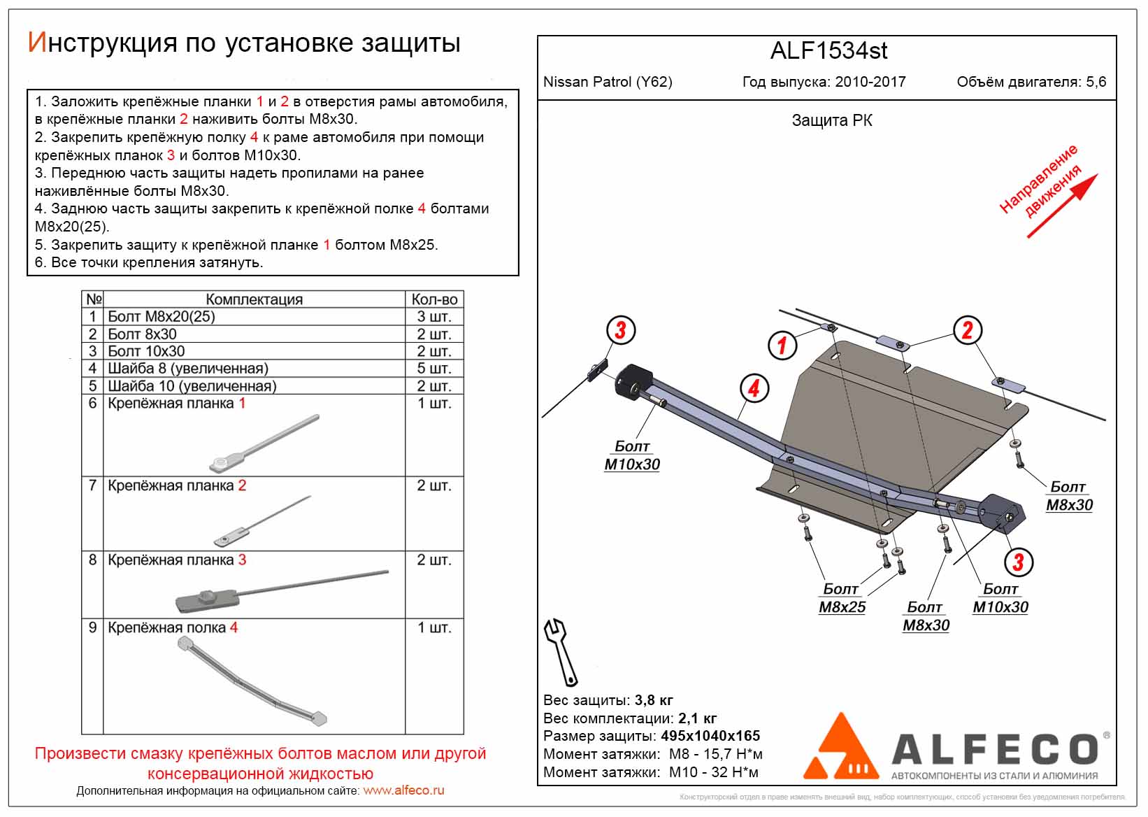 Защита РК Nissan Patrol (Y62) 2010-2017 V-5,6 , ALFeco, алюминий 4мм, арт. ALF1534al