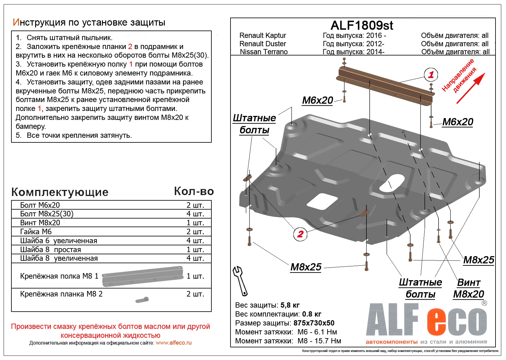 Защита картера и КПП ALFeco арт. ALF1809al изготовлена из алюминия толщиной 4мм специально для автомобиля Nissan Terrano 2014-2022. Обеспечивает надежную защиту агрегатов от механических повреждений и попадания дорожной грязи и других предметов, встречающихся на проезжей части, способных зачастую нанести серьезный вред автомобилю. В комплекте идет весь необходимый крепеж для установки. Наличие можно уточнить по телефону. Возможна установка в нашем автосервисе по предварительной записи