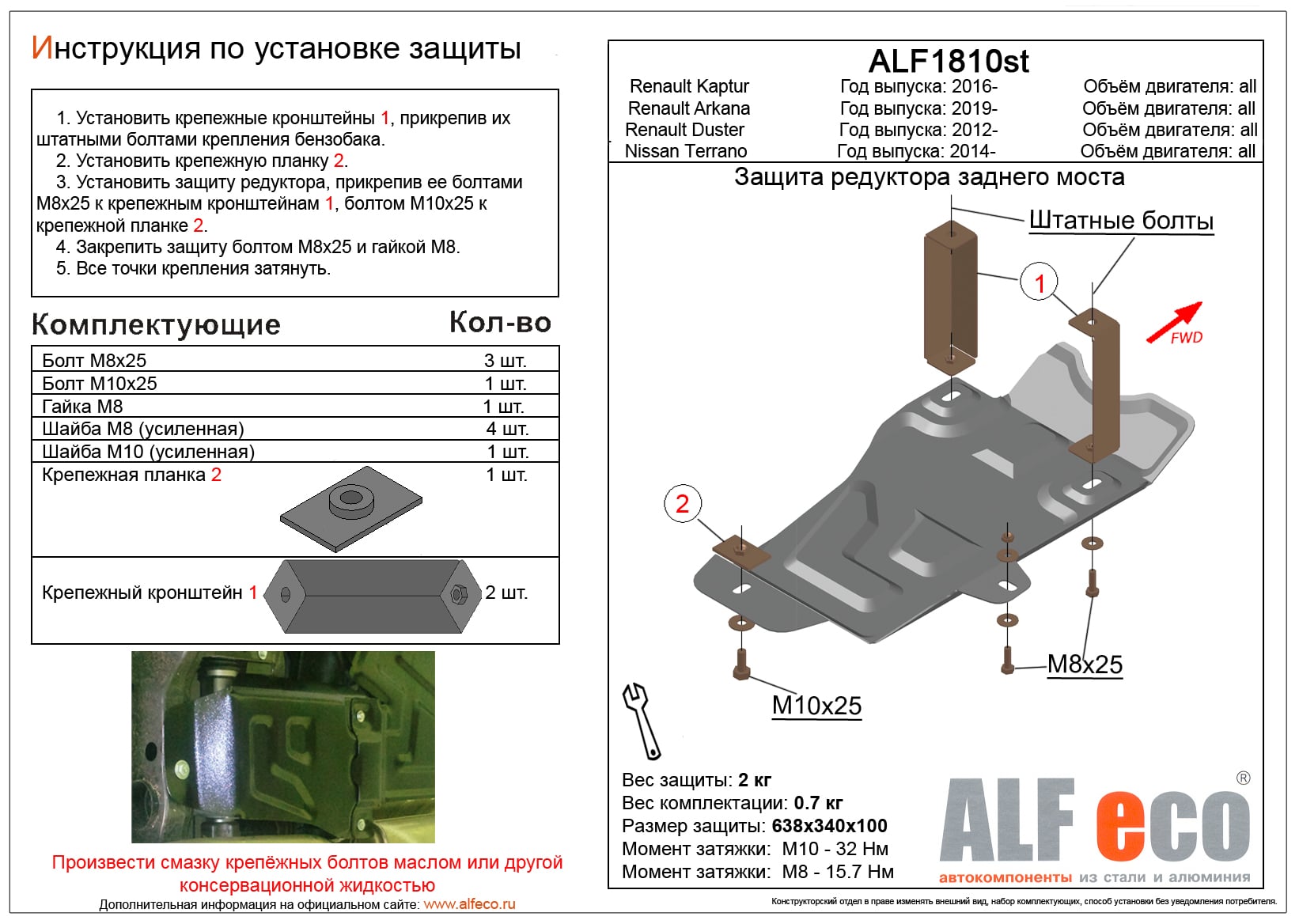 Защита редуктора заднего моста ALFeco арт. ALF1810al изготовлена из алюминия толщиной 4мм специально для автомобиля Nissan Terrano 2014-. Обеспечивает надежную защиту агрегатов от механических повреждений и попадания дорожной грязи и других предметов, встречающихся на проезжей части, способных зачастую нанести серьезный вред автомобилю. В комплекте идет весь необходимый крепеж для установки. Наличие можно уточнить по телефону. Возможна установка в нашем автосервисе по предварительной записи