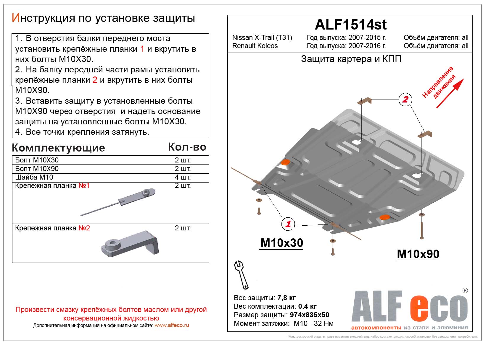 Защита картера и КПП ALFeco арт. ALF1514st изготовлена из стали толщиной 2мм специально для автомобиля Nissan X-Trail (T31) 2007-2015. Обеспечивает надежную защиту агрегатов от механических повреждений и попадания дорожной грязи и других предметов, встречающихся на проезжей части, способных зачастую нанести серьезный вред автомобилю.