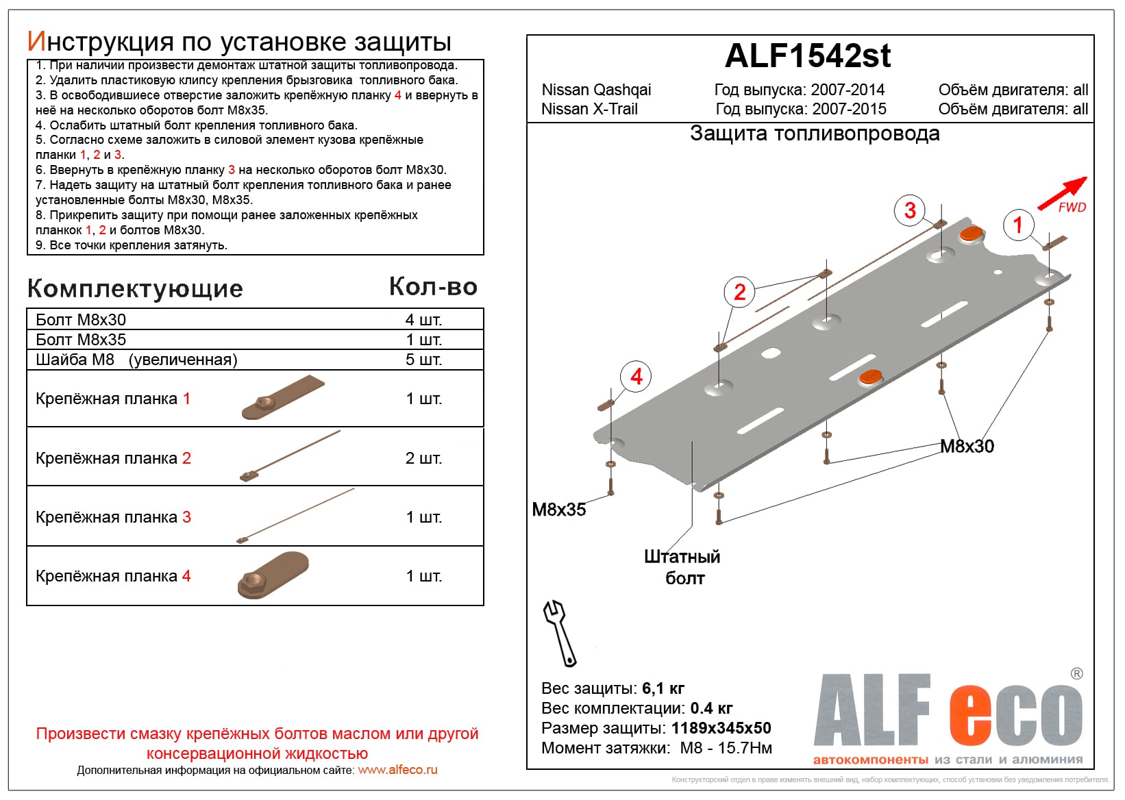 Защита топливопровода ALFeco арт. ALF1542st изготовлена из стали толщиной 2мм специально для автомобиля Nissan X-Trail (T31) 2007-2015. Обеспечивает надежную защиту агрегатов от механических повреждений и попадания дорожной грязи и других предметов, встречающихся на проезжей части, способных зачастую нанести серьезный вред автомобилю. В комплекте идет весь необходимый крепеж для установки. Наличие можно уточнить по телефону. Возможна установка в нашем автосервисе по предварительной записи