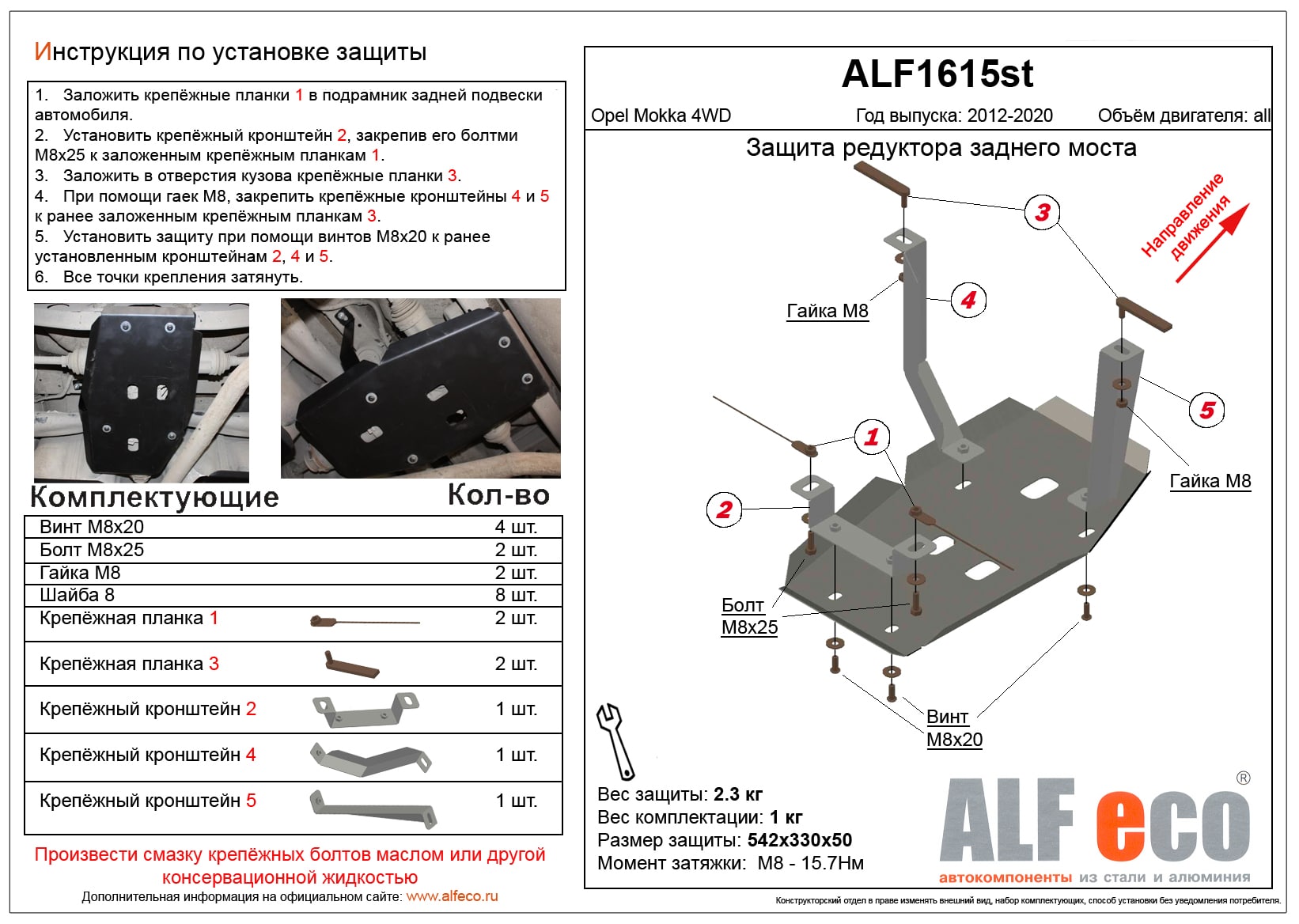Защита редуктора заднего моста ALFeco арт. ALF1615st изготовлена из стали толщиной 2мм специально для автомобиля Opel Mokka 2012-. Обеспечивает надежную защиту агрегатов от механических повреждений и попадания дорожной грязи и других предметов, встречающихся на проезжей части, способных зачастую нанести серьезный вред автомобилю. В комплекте идет весь необходимый крепеж для установки. Наличие можно уточнить по телефону. Возможна установка в нашем автосервисе по предварительной записи