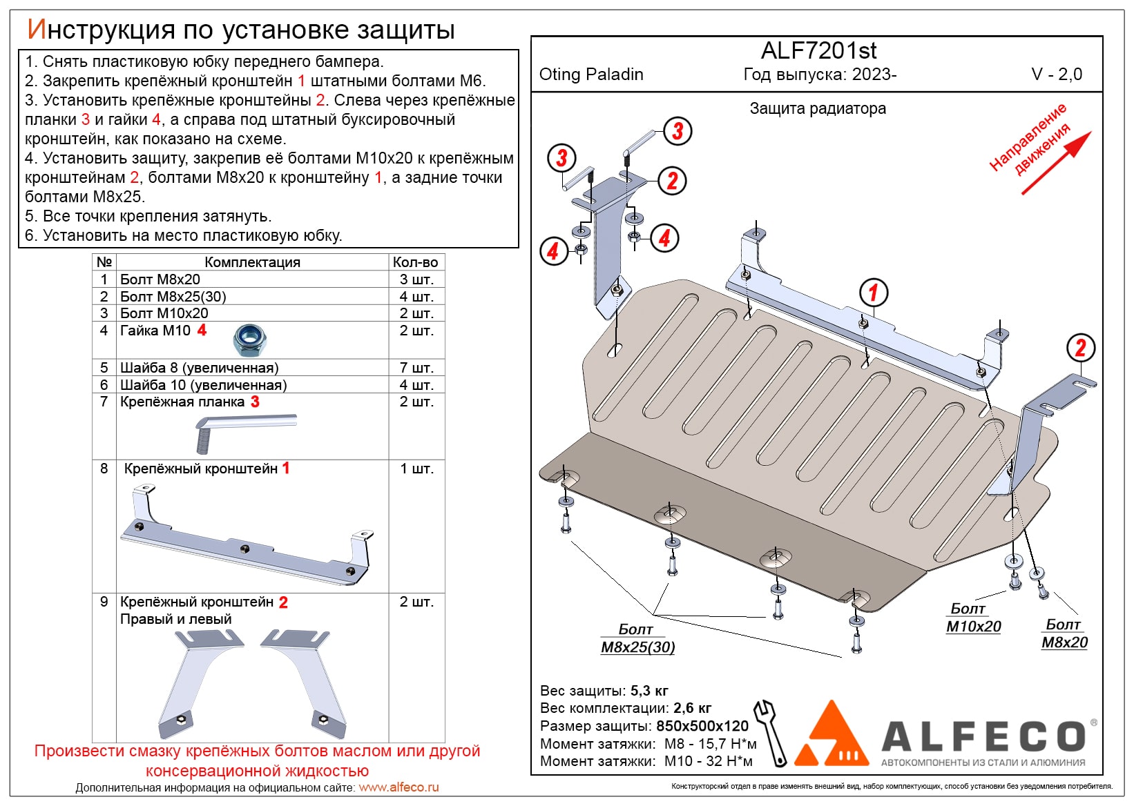 Защита радиатора ALFeco арт. ALF7201al изготовлена из алюминия толщиной 4 мм специально для автомобиля Oting Paladin 2023- . Обеспечивает надежную защиту агрегатов от механических повреждений и попадания дорожной грязи и других предметов, встречающихся на проезжей части, способных зачастую нанести серьезный вред автомобилю. В комплекте идет весь необходимый крепеж для установки. Наличие можно уточнить по телефону. Возможна установка в нашем автосервисе по предварительной записи