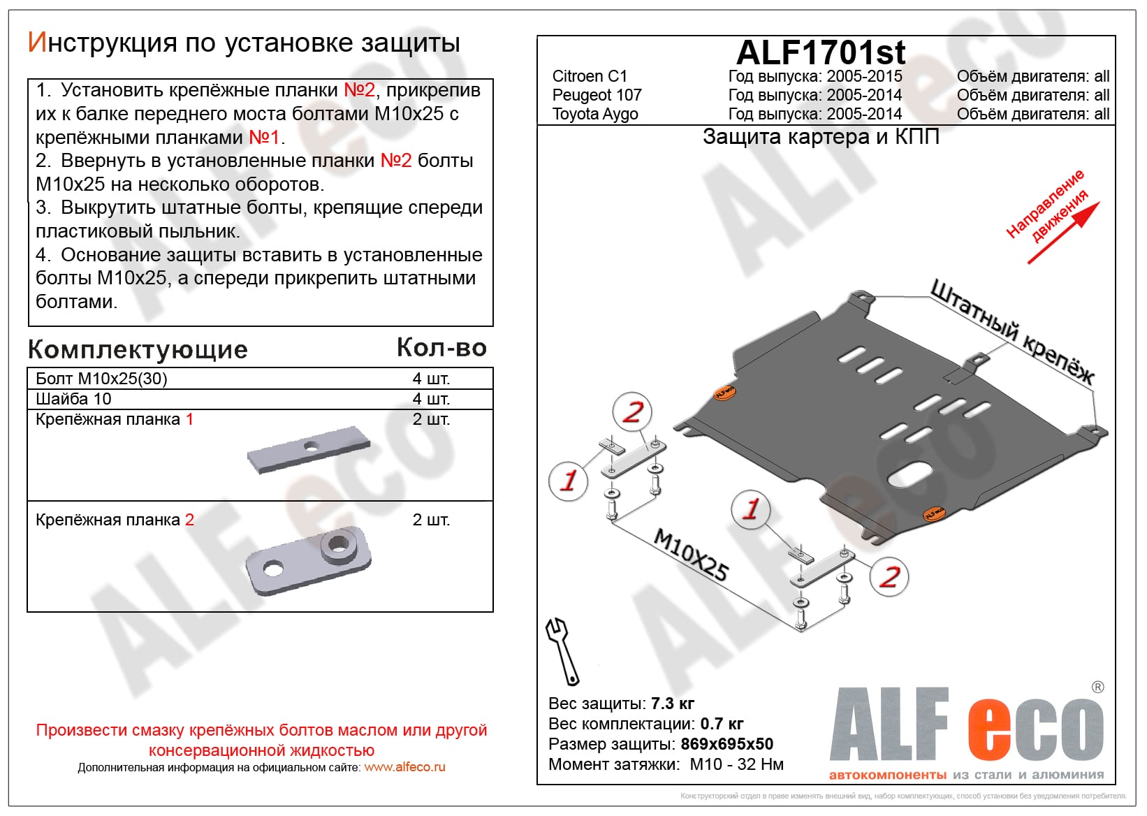 Защита картера и КПП ALFeco арт. ALF1701st-1 изготовлена из стали толщиной 2мм специально для автомобиля Peugeot 107 2005-2014. Обеспечивает надежную защиту агрегатов от механических повреждений и попадания дорожной грязи и других предметов, встречающихся на проезжей части, способных зачастую нанести серьезный вред автомобилю.