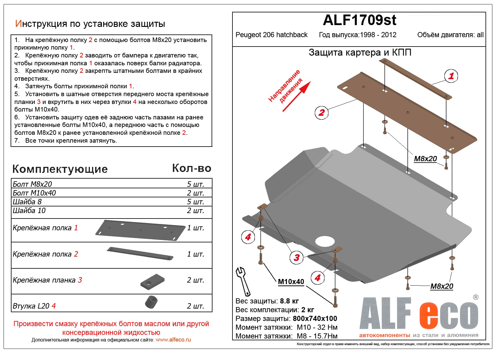 Защита картера и КПП ALFeco арт. ALF1709st изготовлена из стали толщиной 2мм специально для автомобиля Peugeot 206 (hatchback) 1998-2006. Обеспечивает надежную защиту агрегатов от механических повреждений и попадания дорожной грязи и других предметов, встречающихся на проезжей части, способных зачастую нанести серьезный вред автомобилю. В комплекте идет весь необходимый крепеж для установки. Наличие можно уточнить по телефону. Возможна установка в нашем автосервисе по предварительной записи
