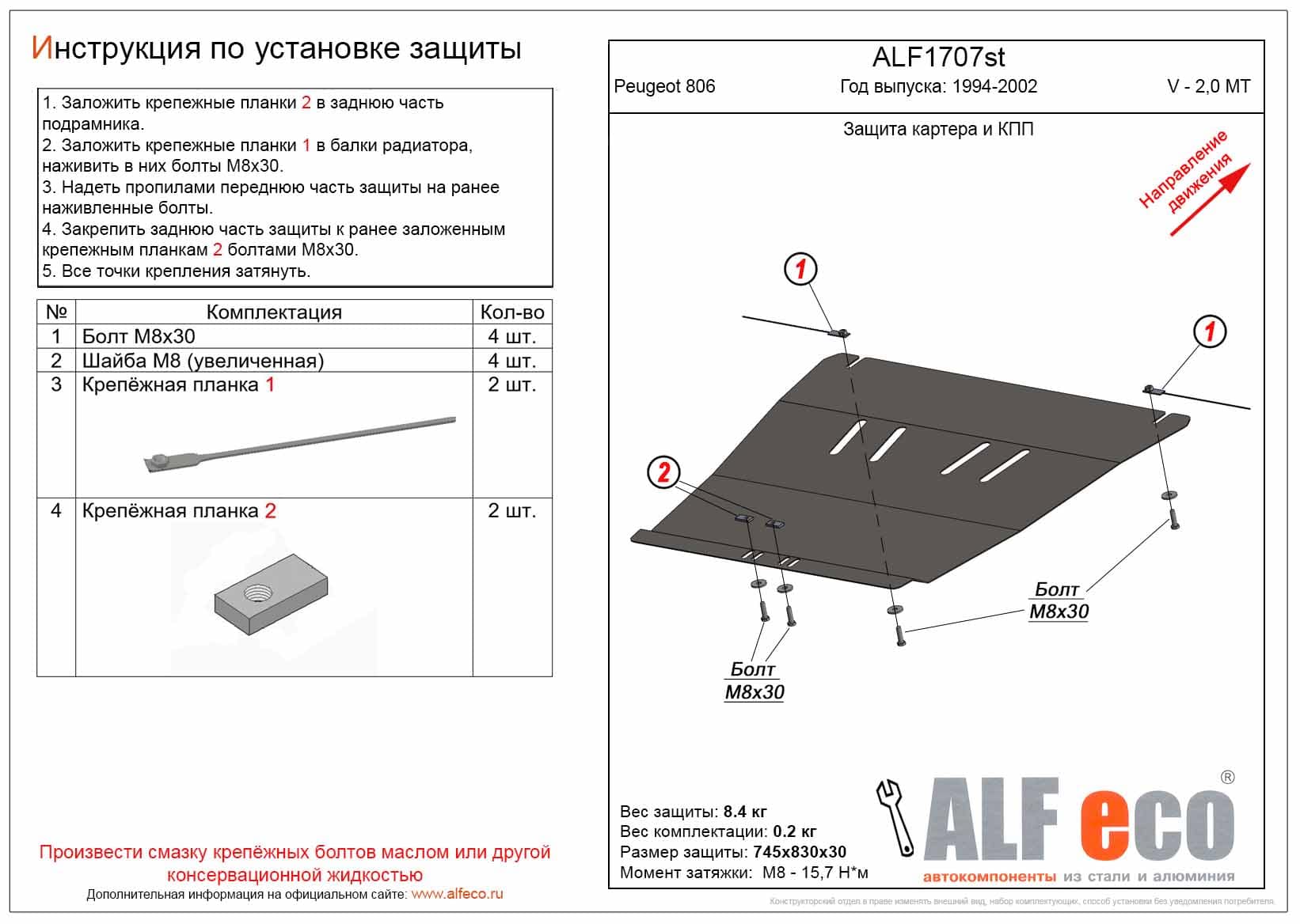 Защита картера и КПП ALFeco арт. ALF1707st изготовлена из стали толщиной 2мм специально для автомобиля Peugeot 806 1994-2002. Обеспечивает надежную защиту агрегатов от механических повреждений и попадания дорожной грязи и других предметов, встречающихся на проезжей части, способных зачастую нанести серьезный вред автомобилю. В комплекте идет весь необходимый крепеж для установки. Наличие можно уточнить по телефону. Возможна установка в нашем автосервисе по предварительной записи