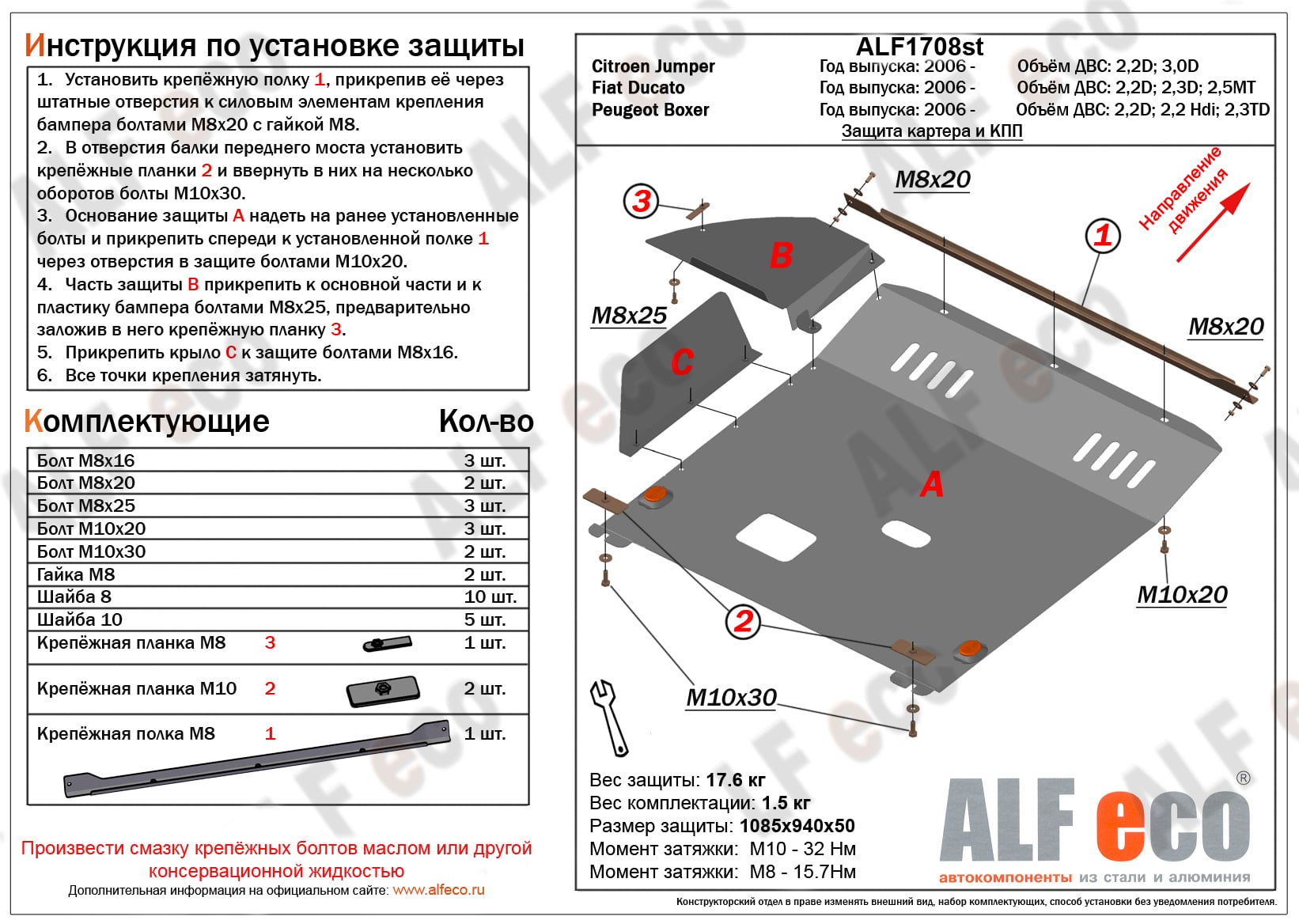 Защита картера и КПП ALFeco арт. ALF1708al изготовлена из алюминия толщиной 4мм специально для автомобиля Peugeot Boxer 250 кузов 2006-. Обеспечивает надежную защиту агрегатов от механических повреждений и попадания дорожной грязи и других предметов, встречающихся на проезжей части, способных зачастую нанести серьезный вред автомобилю. В комплекте идет весь необходимый крепеж для установки. Наличие можно уточнить по телефону. Возможна установка в нашем автосервисе по предварительной записи