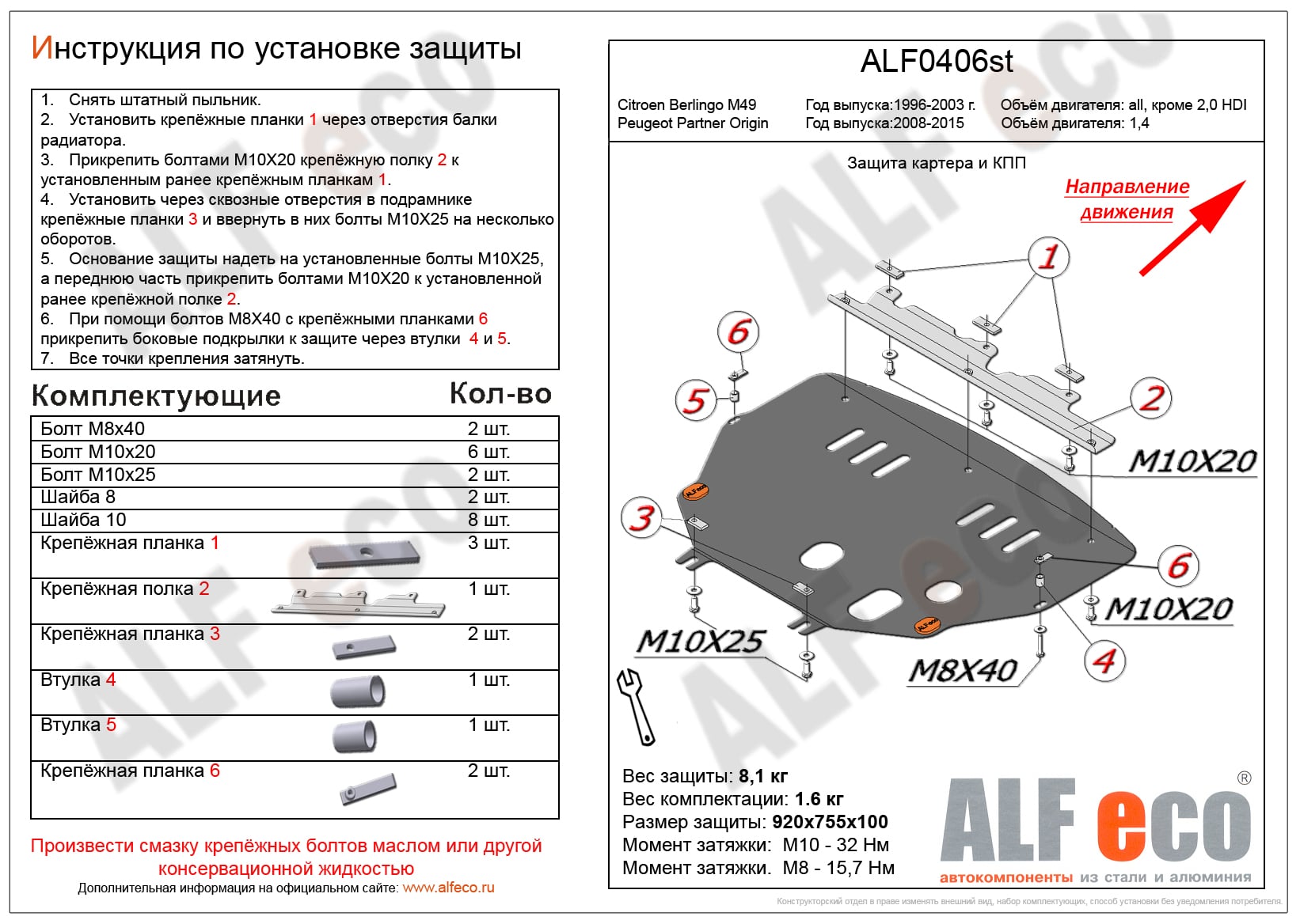 Защита картера и КПП ALFeco арт. ALF0406st-1 изготовлена из стали толщиной 2мм специально для автомобиля Peugeot Partner Origin 2008-2015. Обеспечивает надежную защиту агрегатов от механических повреждений и попадания дорожной грязи и других предметов, встречающихся на проезжей части, способных зачастую нанести серьезный вред автомобилю. В комплекте идет весь необходимый крепеж для установки. Наличие можно уточнить по телефону. Возможна установка в нашем автосервисе по предварительной записи