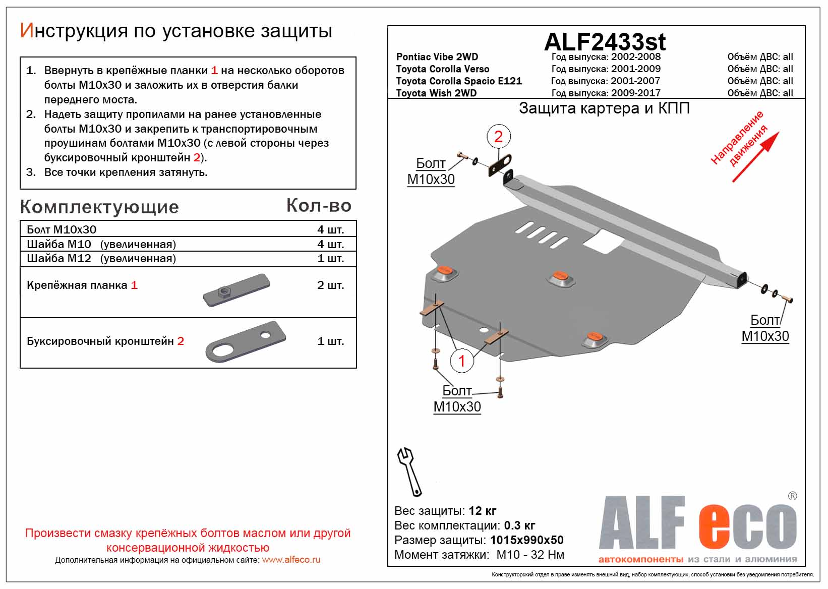 Защита картера и КПП ALFeco арт. ALF2433al-1 изготовлена из алюминия толщиной 4мм специально для автомобиля Pontiac Vibe 2002-2008. Обеспечивает надежную защиту агрегатов от механических повреждений и попадания дорожной грязи и других предметов, встречающихся на проезжей части, способных зачастую нанести серьезный вред автомобилю. В комплекте идет весь необходимый крепеж для установки. Наличие можно уточнить по телефону. Возможна установка в нашем автосервисе по предварительной записи