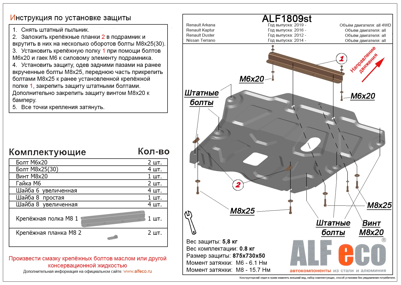 Защита картера и КПП ALFeco арт. ALF1809al-1 изготовлена из алюминия толщиной 4мм специально для автомобиля Renault Duster 2012-2022 . Обеспечивает надежную защиту агрегатов от механических повреждений и попадания дорожной грязи и других предметов, встречающихся на проезжей части, способных зачастую нанести серьезный вред автомобилю. В комплекте идет весь необходимый крепеж для установки. Наличие можно уточнить по телефону. Возможна установка в нашем автосервисе по предварительной записи