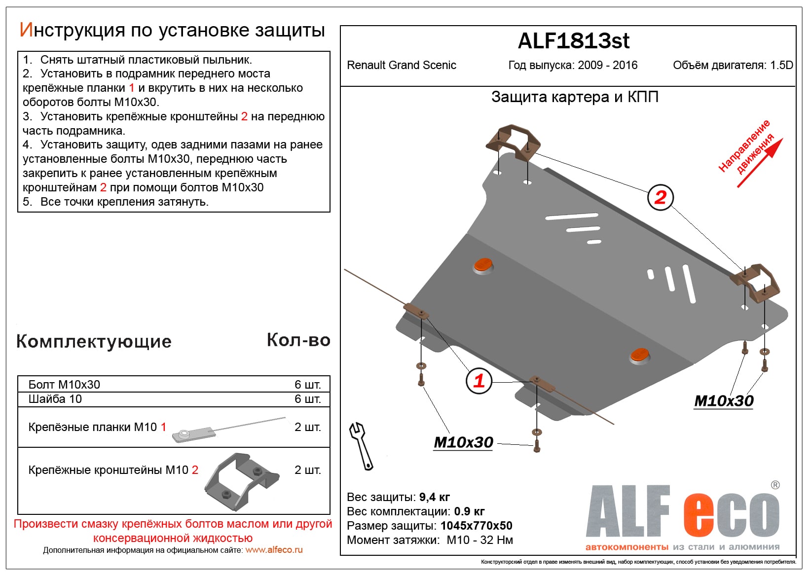 Защита картера и КПП ALFeco арт. ALF1813st изготовлена из стали толщиной 2мм специально для автомобиля Renault Grand Scenic III 2009-2016. Обеспечивает надежную защиту агрегатов от механических повреждений и попадания дорожной грязи и других предметов, встречающихся на проезжей части, способных зачастую нанести серьезный вред автомобилю. В комплекте идет весь необходимый крепеж для установки. Наличие можно уточнить по телефону. Возможна установка в нашем автосервисе по предварительной записи