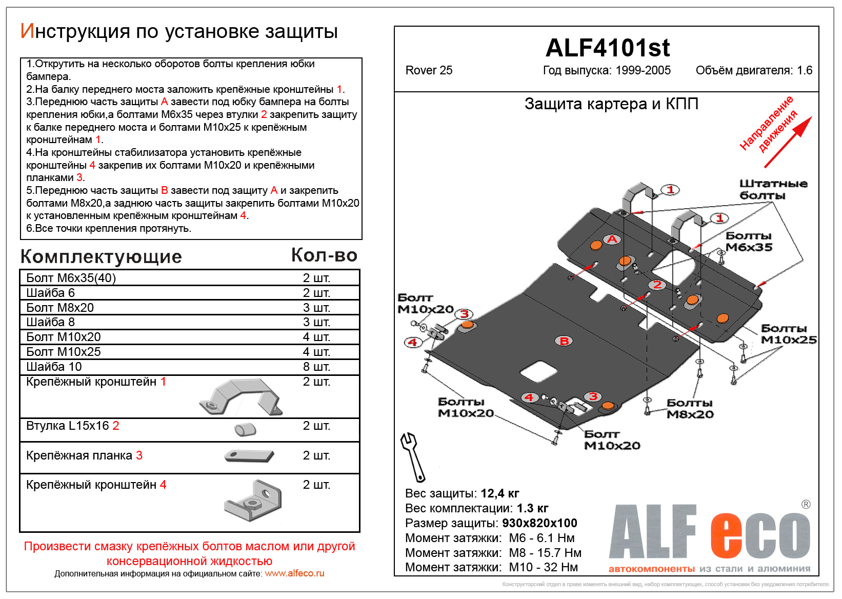 Защита картера и КПП (2 части) ALFeco арт. ALF4101al изготовлена из алюминия толщиной 4мм специально для автомобиля Rover 25 1999-2005. Обеспечивает надежную защиту агрегатов от механических повреждений и попадания дорожной грязи и других предметов, встречающихся на проезжей части, способных зачастую нанести серьезный вред автомобилю. В комплекте идет весь необходимый крепеж для установки. Наличие можно уточнить по телефону. Возможна установка в нашем автосервисе по предварительной записи