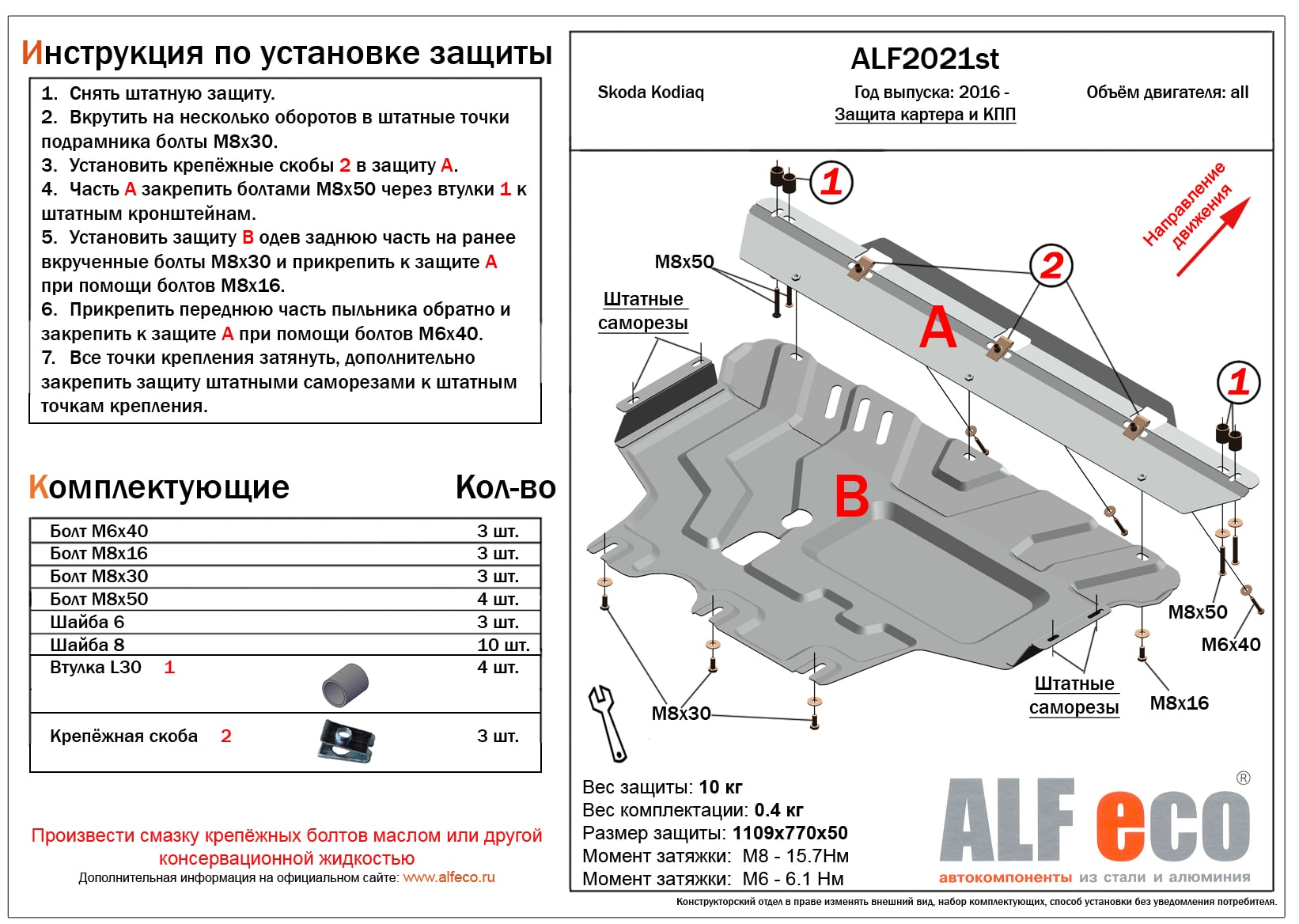Защита картера и КПП ALFeco арт. ALF2021st изготовлена из стали толщиной 1.5мм специально для автомобиля Skoda Kodiaq 2016-. Обеспечивает надежную защиту агрегатов от механических повреждений и попадания дорожной грязи и других предметов, встречающихся на проезжей части, способных зачастую нанести серьезный вред автомобилю. В комплекте идет весь необходимый крепеж для установки. Наличие можно уточнить по телефону. Возможна установка в нашем автосервисе по предварительной записи