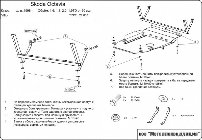 Приобретая стальную защиту 21.0033 для SKODA Octavia A4 (Tour) от 90 лс 1996 - 2010, вы можете установить ее в нашем сервисе. Стоимость установки от 1100 рублей за лист, предварительно необходимо записаться по телефону на удобное для вас время.