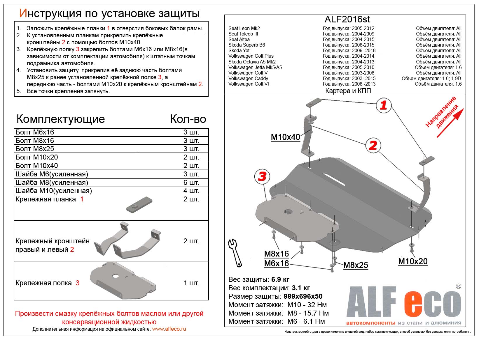 Защита картера и КПП ALFeco арт. ALF2016al-4 изготовлена из алюминия толщиной 4мм специально для автомобиля Skoda Superb (B6/3T) 2008-2015. Обеспечивает надежную защиту агрегатов от механических повреждений и попадания дорожной грязи и других предметов, встречающихся на проезжей части, способных зачастую нанести серьезный вред автомобилю.