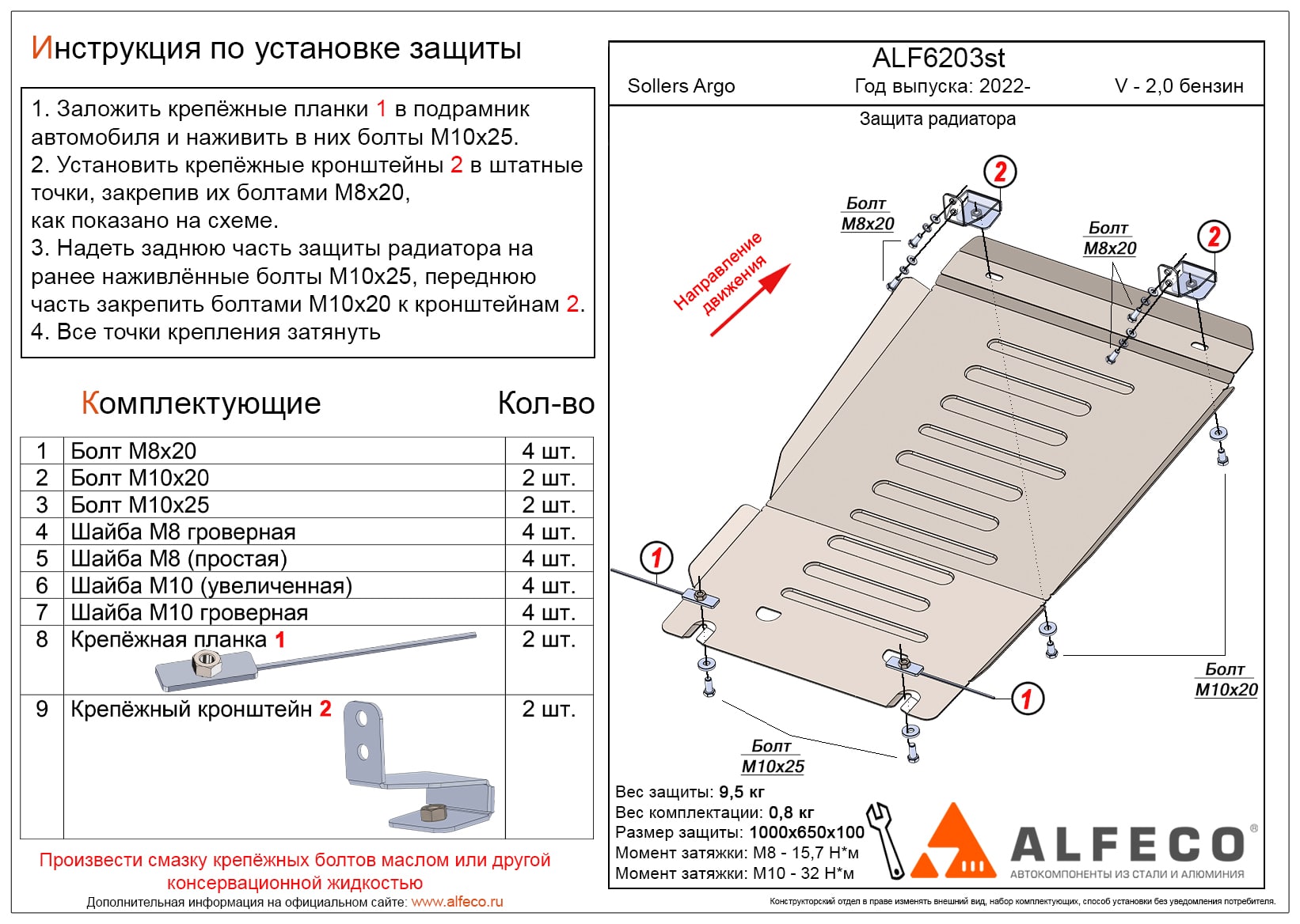 Защита радиатора ALFeco арт. ALF6203st изготовлена из стали толщиной 2 мм специально для автомобиля Sollers Argo 2022-. Обеспечивает надежную защиту агрегатов от механических повреждений и попадания дорожной грязи и других предметов, встречающихся на проезжей части, способных зачастую нанести серьезный вред автомобилю. В комплекте идет весь необходимый крепеж для установки. Наличие можно уточнить по телефону. Возможна установка в нашем автосервисе по предварительной записи