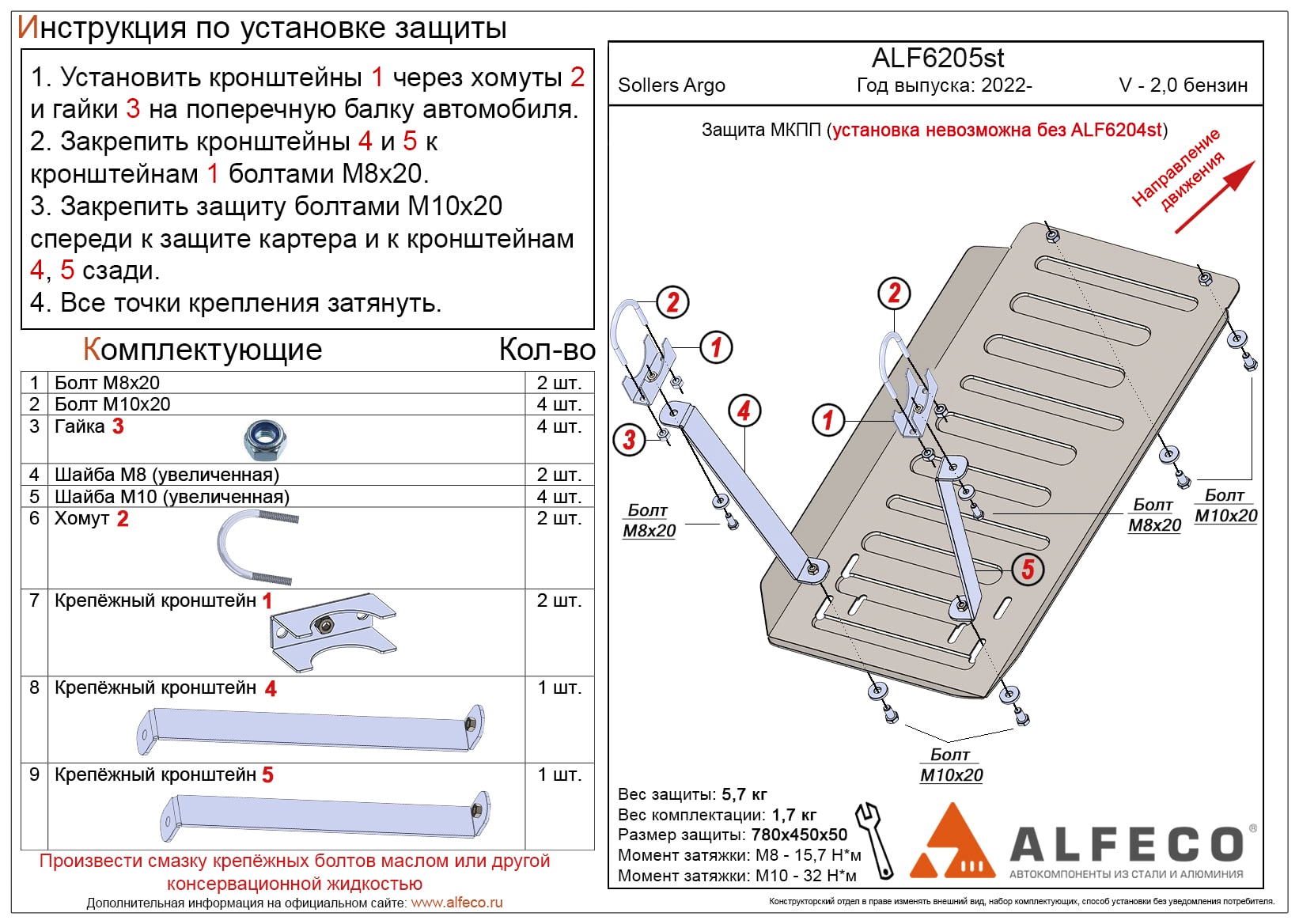 Защита МКПП ALFeco арт. ALF6205st изготовлена из стали толщиной 2 мм специально для автомобиля Sollers Argo 2022-. Обеспечивает надежную защиту агрегатов от механических повреждений и попадания дорожной грязи и других предметов, встречающихся на проезжей части, способных зачастую нанести серьезный вред автомобилю. В комплекте идет весь необходимый крепеж для установки. Наличие можно уточнить по телефону. Возможна установка в нашем автосервисе по предварительной записи