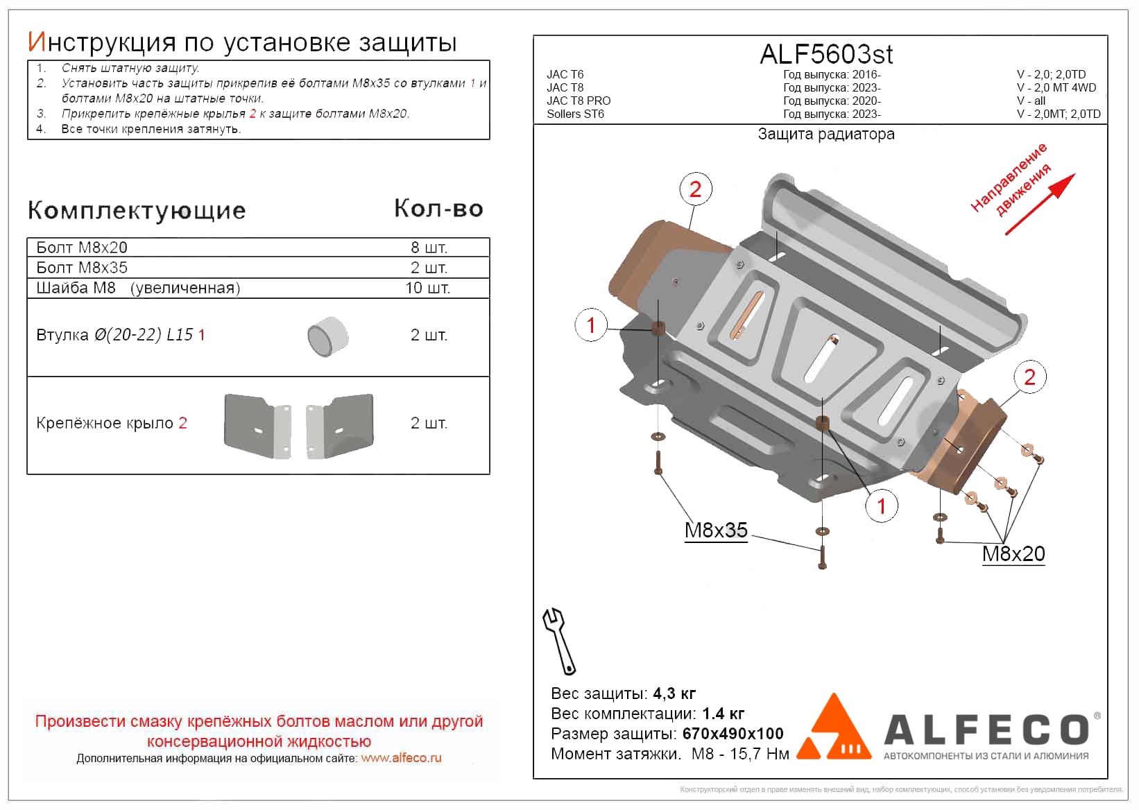 Защита радиатора ALFeco арт. ALF5603st-2 изготовлена из стали толщиной 2 мм специально для автомобиля Sollers ST6 2023- . Обеспечивает надежную защиту агрегатов от механических повреждений и попадания дорожной грязи и других предметов, встречающихся на проезжей части, способных зачастую нанести серьезный вред автомобилю. В комплекте идет весь необходимый крепеж для установки. Наличие можно уточнить по телефону. Возможна установка в нашем автосервисе по предварительной записи