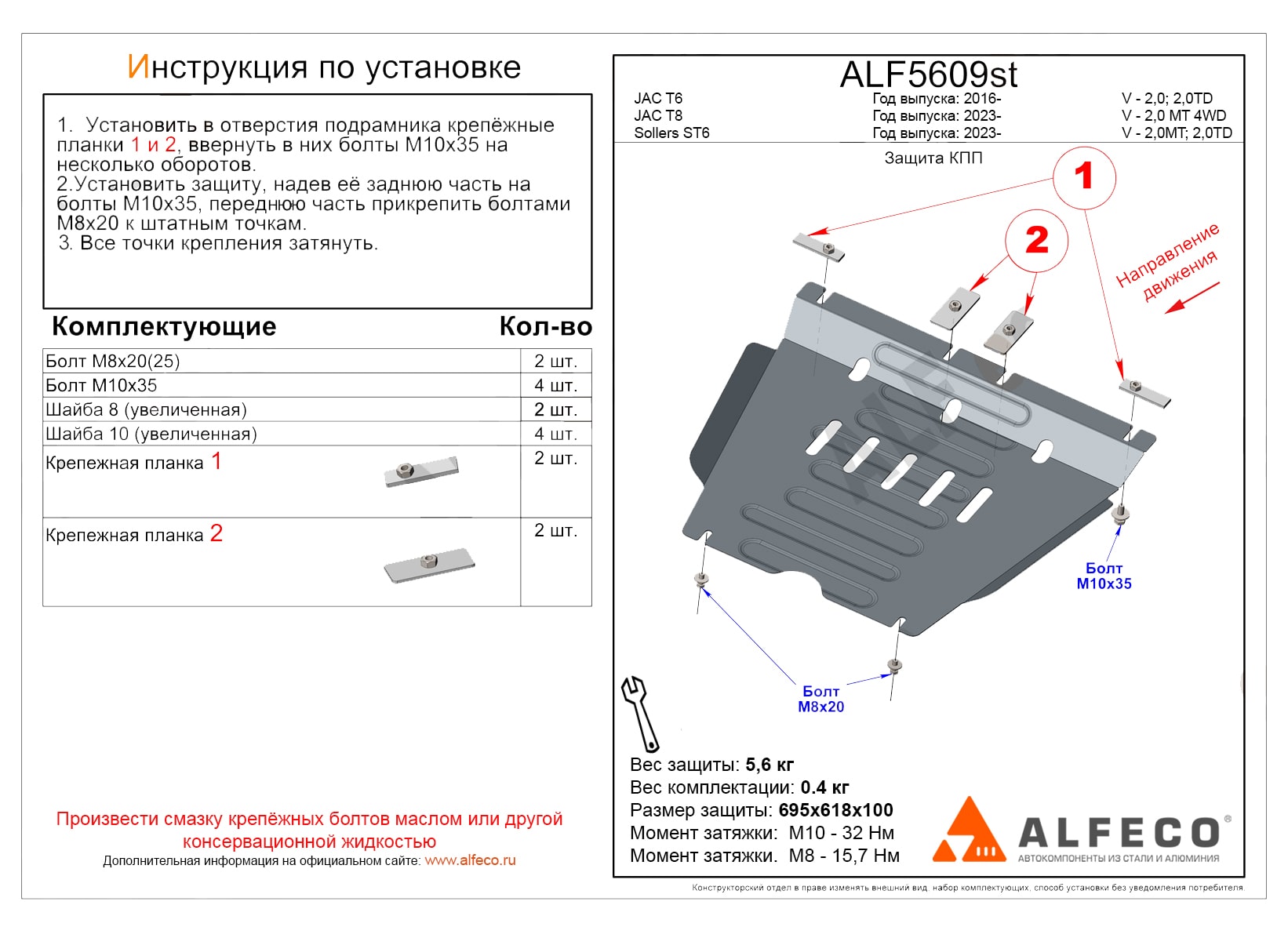 Защита КПП ALFeco арт. ALF5609al-2 изготовлена из алюминия толщиной 4 мм специально для автомобиля Sollers ST6 2023- . Обеспечивает надежную защиту агрегатов от механических повреждений и попадания дорожной грязи и других предметов, встречающихся на проезжей части, способных зачастую нанести серьезный вред автомобилю. В комплекте идет весь необходимый крепеж для установки. Наличие можно уточнить по телефону. Возможна установка в нашем автосервисе по предварительной записи