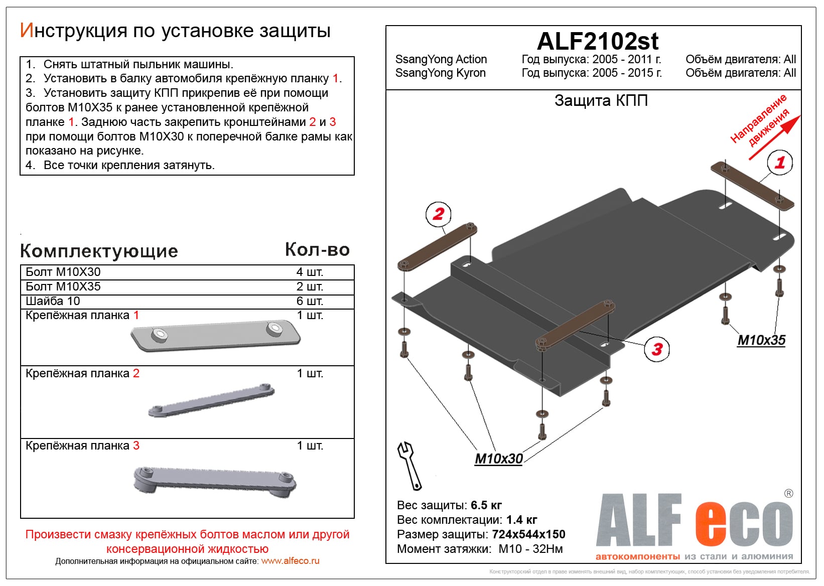 Защита КПП ALFeco арт. ALF2102al-1 изготовлена из алюминия толщиной 4мм специально для автомобиля SsangYong Kyron 2005-2015. Обеспечивает надежную защиту агрегатов от механических повреждений и попадания дорожной грязи и других предметов, встречающихся на проезжей части, способных зачастую нанести серьезный вред автомобилю. В комплекте идет весь необходимый крепеж для установки. Наличие можно уточнить по телефону. Возможна установка в нашем автосервисе по предварительной записи