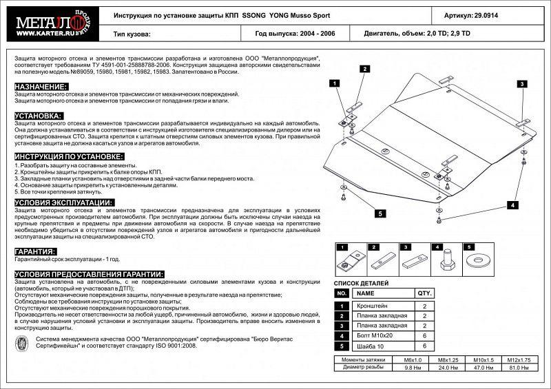 Приобретая стальную защиту 29.0914 для SSANG YONG Musso Sport 2004 - 2006, вы можете установить ее в нашем сервисе. Стоимость установки от 1100 рублей за лист, предварительно необходимо записаться по телефону на удобное для вас время.