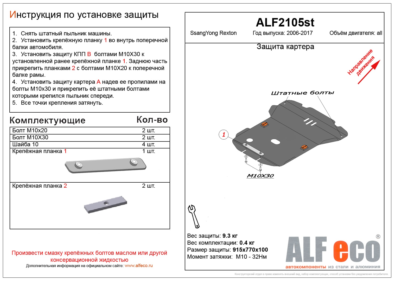 Защита картера ALFeco арт. ALF2105st изготовлена из стали толщиной 2мм специально для автомобиля SsangYong Rexton II (Y250) 2006-2017. Обеспечивает надежную защиту агрегатов от механических повреждений и попадания дорожной грязи и других предметов, встречающихся на проезжей части, способных зачастую нанести серьезный вред автомобилю.