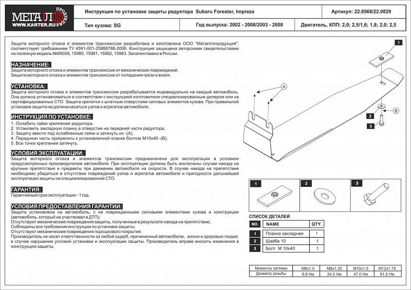 Приобретая стальную защиту 22.0568 для SUBARU Impreza 2003 - 2008, вы можете установить ее в нашем сервисе. Стоимость установки от 1100 рублей за лист, предварительно необходимо записаться по телефону на удобное для вас время.