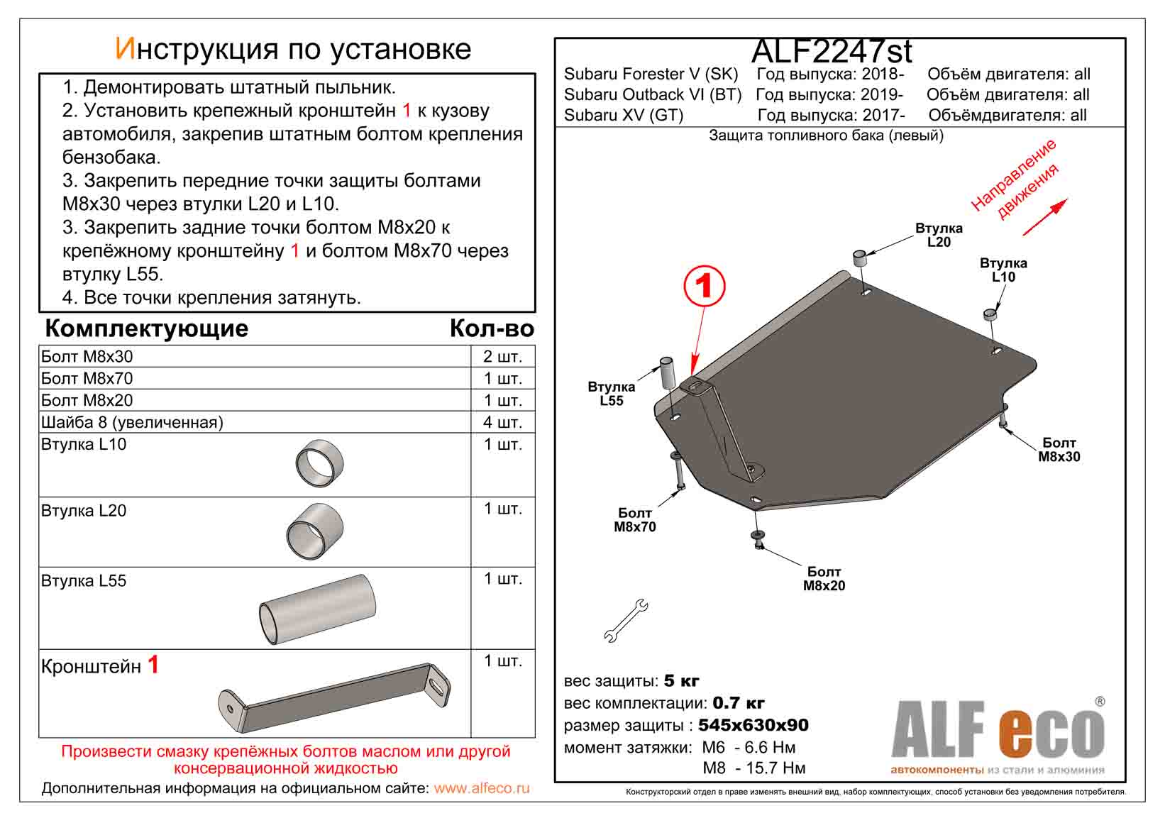 Защита топливного бака (левый) ALFeco арт. ALF2247al изготовлена из алюминия толщиной 4мм специально для автомобиля Subaru Forester V (SK) 2018-. Обеспечивает надежную защиту агрегатов от механических повреждений и попадания дорожной грязи и других предметов, встречающихся на проезжей части, способных зачастую нанести серьезный вред автомобилю. В комплекте идет весь необходимый крепеж для установки. Наличие можно уточнить по телефону. Возможна установка в нашем автосервисе по предварительной записи