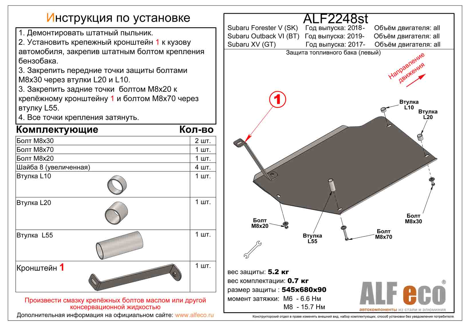 Защита топливного бака (правый) ALFeco арт. ALF2248al изготовлена из алюминия толщиной 4мм специально для автомобиля Subaru Forester V (SK) 2018-. Обеспечивает надежную защиту агрегатов от механических повреждений и попадания дорожной грязи и других предметов, встречающихся на проезжей части, способных зачастую нанести серьезный вред автомобилю. В комплекте идет весь необходимый крепеж для установки. Наличие можно уточнить по телефону. Возможна установка в нашем автосервисе по предварительной записи