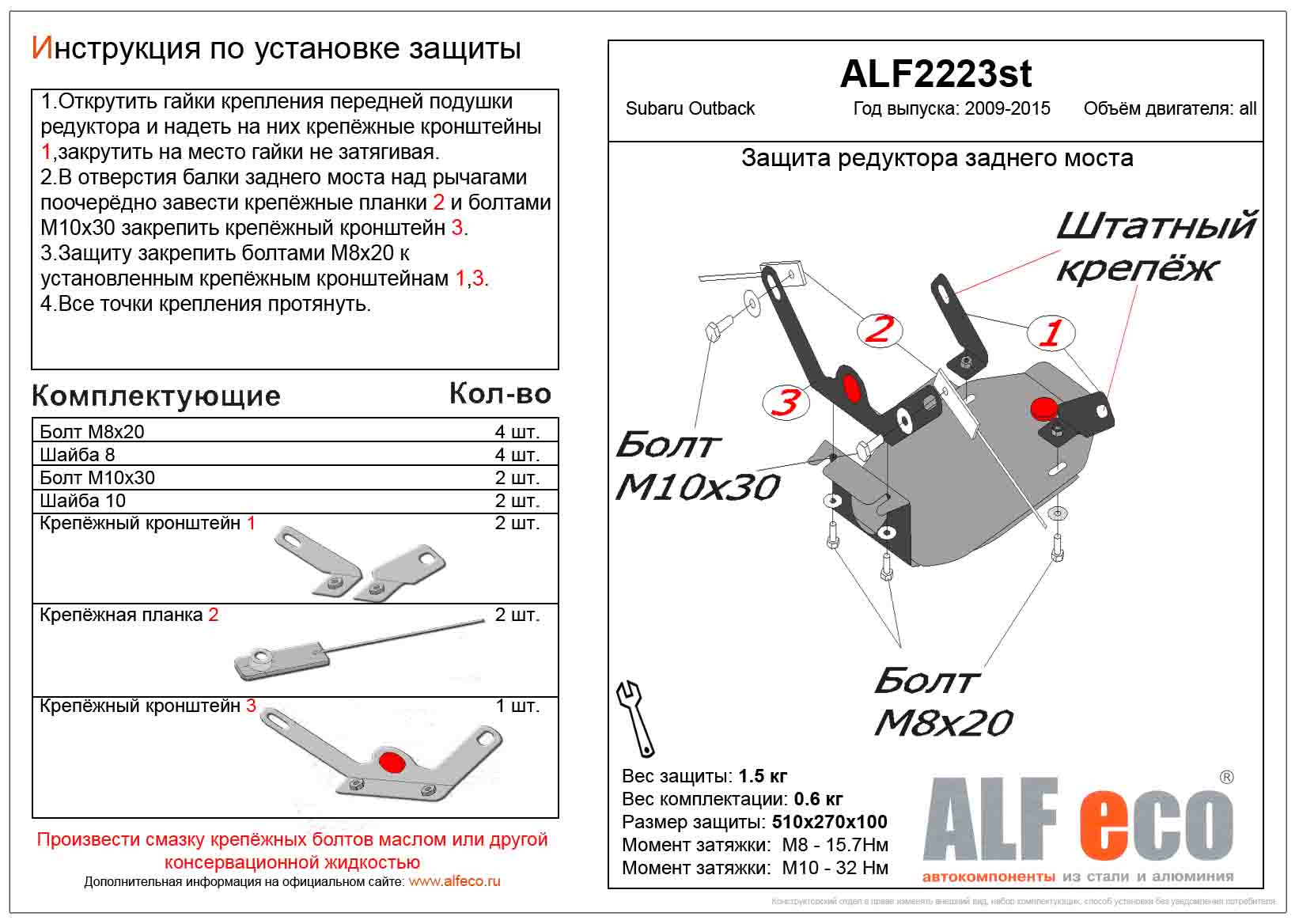 Защита редуктора заднего моста ALFeco арт. ALF2223st изготовлена из стали толщиной 2мм специально для автомобиля Subaru Outback IV (BR) 2009-2015. Обеспечивает надежную защиту агрегатов от механических повреждений и попадания дорожной грязи и других предметов, встречающихся на проезжей части, способных зачастую нанести серьезный вред автомобилю. В комплекте идет весь необходимый крепеж для установки. Наличие можно уточнить по телефону. Возможна установка в нашем автосервисе по предварительной записи